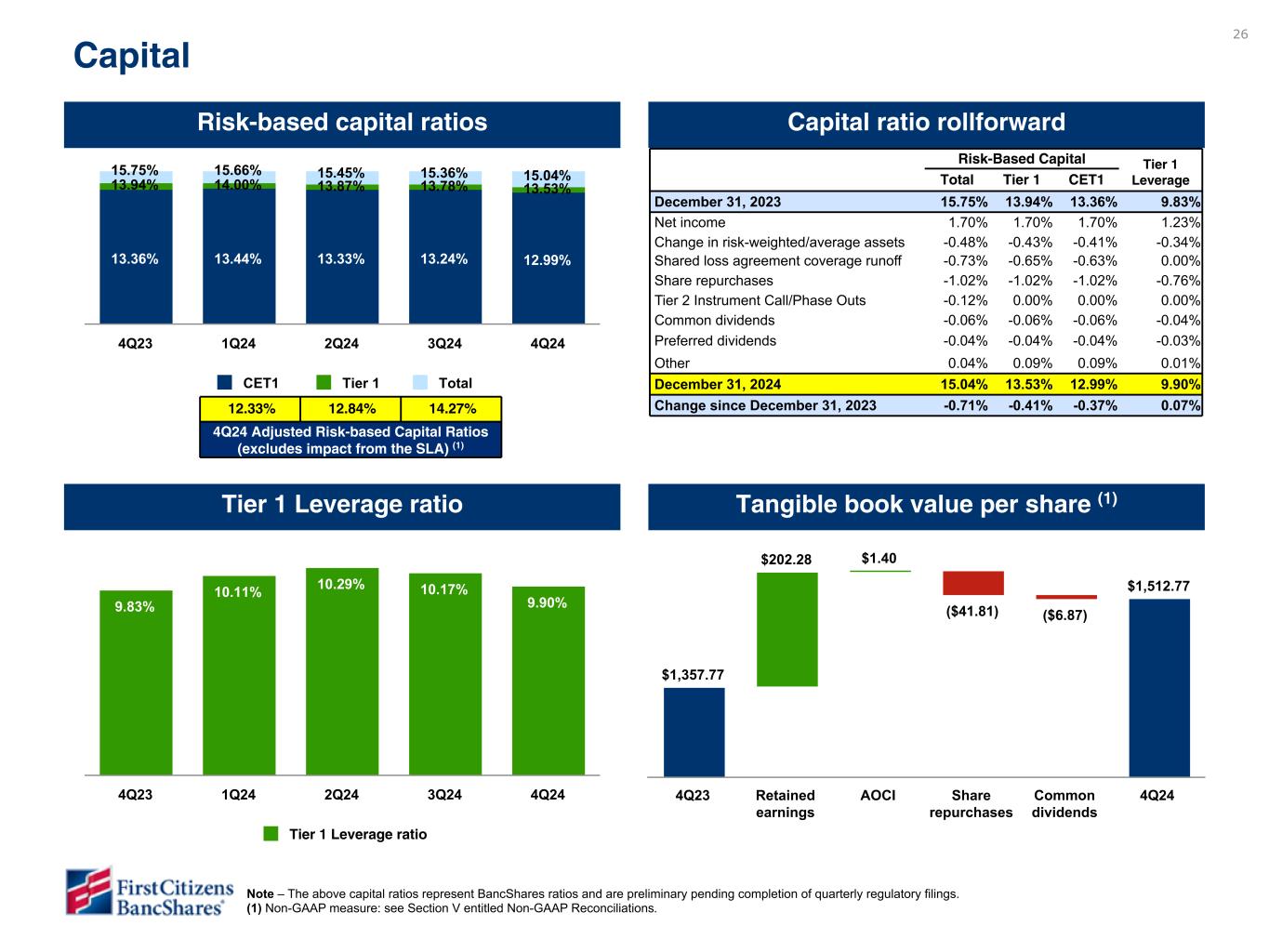 26 9.83% 10.11% 10.29% 10.17% 9.90% Tier 1 Leverage ratio 4Q23 1Q24 2Q24 3Q24 4Q24 Risk-based capital ratios Capital ratio rollforward Tier 1 Leverage ratio Tangible book value per share (1) Capital Risk-Based Capital Tier 1 Leverage Total Tier 1 CET1 December 31, 2023 15.75 % 13.94 % 13.36 % 9.83 % Net income 1.70 % 1.70 % 1.70 % 1.23 % Change in risk-weighted/average assets -0.48 % -0.43 % -0.41 % -0.34 % Shared loss agreement coverage runoff -0.73 % -0.65 % -0.63 % 0.00 % Share repurchases -1.02 % -1.02 % -1.02 % -0.76 % Tier 2 Instrument Call/Phase Outs -0.12 % 0.00 % 0.00 % 0.00 % Common dividends -0.06 % -0.06 % -0.06 % -0.04 % Preferred dividends -0.04 % -0.04 % -0.04 % -0.03 % Other 0.04 % 0.09 % 0.09 % 0.01 % December 31, 2024 15.04 % 13.53 % 12.99 % 9.90 % Change since December 31, 2023 -0.71 % -0.41 % -0.37 % 0.07 % 13.36% 13.44% 13.33% 13.24% 12.99% 13.94% 14.00% 13.87% 13.78% 13.53% 15.75% 15.66% 15.45% 15.36% 15.04% CET1 Tier 1 Total 4Q23 1Q24 2Q24 3Q24 4Q24 $1,357.77 $202.28 $1.40 ($41.81) ($6.87) $1,512.77 4Q23 Retained earnings AOCI Share repurchases Common dividends 4Q24 Note – The above capital ratios represent BancShares ratios and are preliminary pending completion of quarterly regulatory filings. (1) Non-GAAP measure: see Section V entitled Non-GAAP Reconciliations. 12.33% 12.84% 14.27% 4Q24 Adjusted Risk-based Capital Ratios (excludes impact from the SLA) (1) DRAFT Capital numbers - subject to change DRAFT - Pending updated rollforward from capital team