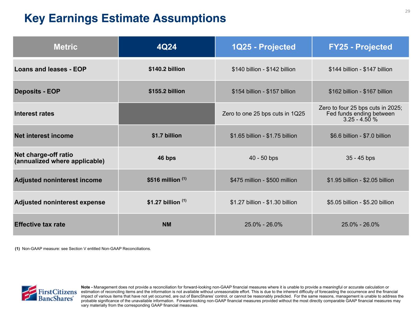 29 Metric 4Q24 1Q25 - Projected FY25 - Projected Loans and leases - EOP $140.2 billion $140 billion - $142 billion $144 billion - $147 billion Deposits - EOP $155.2 billion $154 billion - $157 billion $162 billion - $167 billion Interest rates Zero to one 25 bps cuts in 1Q25 Zero to four 25 bps cuts in 2025; Fed funds ending between 3.25 - 4.50 % Net interest income $1.7 billion $1.65 billion - $1.75 billion $6.6 billion - $7.0 billion Net charge-off ratio (annualized where applicable) 46 bps 40 - 50 bps 35 - 45 bps Adjusted noninterest income $516 million (1) $475 million - $500 million $1.95 billion - $2.05 billion Adjusted noninterest expense $1.27 billion (1) $1.27 billion - $1.30 billion $5.05 billion - $5.20 billion Effective tax rate NM 25.0% - 26.0% 25.0% - 26.0% Key Earnings Estimate Assumptions Please do not review. Data to be provided in a subsequent draft. (1) Non-GAAP measure: see Section V entitled Non-GAAP Reconciliations. Note - Management does not provide a reconciliation for forward-looking non-GAAP financial measures where it is unable to provide a meaningful or accurate calculation or estimation of reconciling items and the information is not available without unreasonable effort. This is due to the inherent difficulty of forecasting the occurrence and the financial impact of various items that have not yet occurred, are out of BancShares’ control, or cannot be reasonably predicted. For the same reasons, management is unable to address the probable significance of the unavailable information. Forward-looking non-GAAP financial measures provided without the most directly comparable GAAP financial measures may vary materially from the corresponding GAAP financial measures. To be updated in subsequent draft