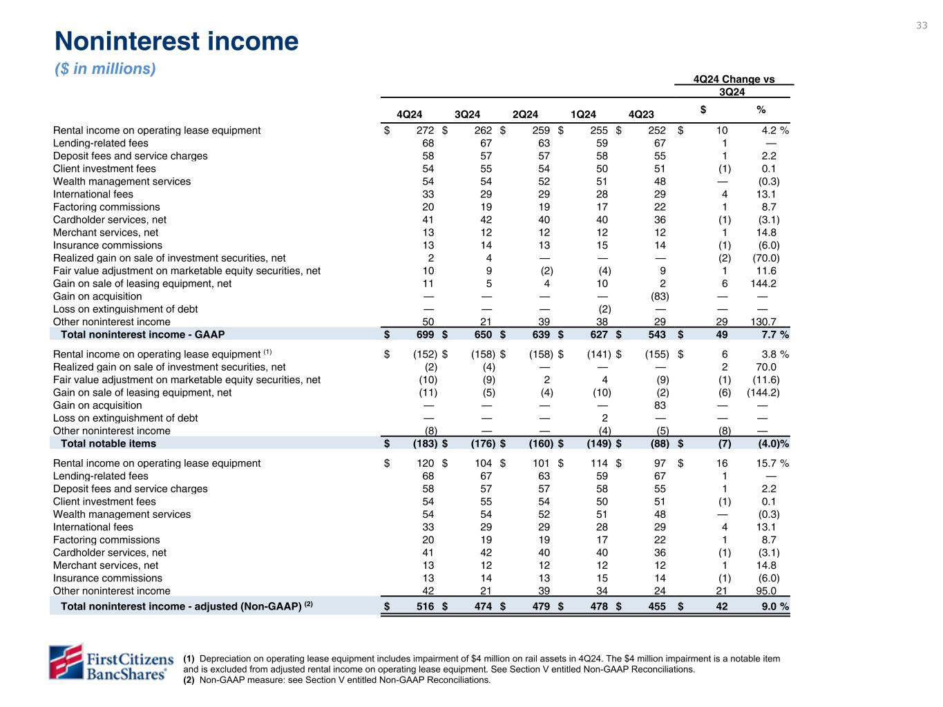 32 4Q24 3Q24 2Q24 1Q24 4Q23 INTEREST INCOME Interest and fees on loans $ 2,322 $ 2,430 $ 2,422 $ 2,354 $ 2,391 Interest on investment securities 377 358 330 282 241 Interest on deposits at banks 302 350 378 448 485 Total interest income 3,001 3,138 3,130 3,084 3,117 INTEREST EXPENSE Deposits 957 1,004 975 928 865 Borrowings 335 338 334 339 341 Total interest expense 1,292 1,342 1,309 1,267 1,206 Net interest income 1,709 1,796 1,821 1,817 1,911 Provision for credit losses 155 117 95 64 249 Net interest income after provision for credit losses 1,554 1,679 1,726 1,753 1,662 NONINTEREST INCOME Rental income on operating lease equipment 272 262 259 255 252 Lending-related fees 68 67 63 59 67 Deposit fees and service charges 58 57 57 58 55 Client investment fees 54 55 54 50 51 Wealth management services 54 54 52 51 48 International fees 33 29 29 28 29 Factoring commissions 20 19 19 17 22 Cardholder services, net 41 42 40 40 36 Merchant services, net 13 12 12 12 12 Insurance commissions 13 14 13 15 14 Realized gain on sale of investment securities, net 2 4 — — — Fair value adjustment on marketable equity securities, net 10 9 (2) (4) 9 Gain on sale of leasing equipment, net 11 5 4 10 2 Gain on acquisition — — — — (83) Loss on extinguishment of debt — — — (2) — Other noninterest income 50 21 39 38 29 Total noninterest income 699 650 639 627 543 NONINTEREST EXPENSE Depreciation on operating lease equipment 101 99 98 96 96 Maintenance and other operating lease expenses 55 59 60 45 59 Personnel cost 801 788 745 744 714 Net occupancy expense 60 62 58 62 65 Equipment expense 136 128 126 114 114 Professional fees 30 42 24 25 28 Third-party processing fees 57 55 58 60 66 FDIC insurance expense 33 31 33 41 82 Marketing expense 24 20 18 14 24 Acquisition-related expenses 62 46 44 58 116 Intangible asset amortization 16 15 15 17 17 Other noninterest expense 142 111 107 100 111 Total noninterest expense 1,517 1,456 1,386 1,376 1,492 Income before income taxes 736 873 979 1,004 713 Income tax expense 36 234 272 273 199 Net income $ 700 $ 639 $ 707 $ 731 $ 514 Preferred stock dividends $ 15 $ 15 $ 16 $ 15 $ 15 Net income available to common stockholders $ 685 $ 624 $ 691 $ 716 $ 499 BancShares Income Statements (unaudited) ($ in millions)