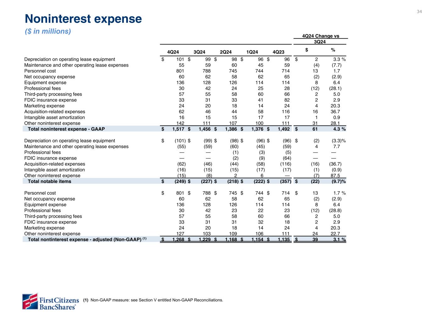 33 Noninterest income ($ in millions) 4Q24 Change vs 3Q24 4Q24 3Q24 2Q24 1Q24 4Q23 $ % Rental income on operating lease equipment $ 272 $ 262 $ 259 $ 255 $ 252 $ 10 4.2 % Lending-related fees 68 67 63 59 67 1 — Deposit fees and service charges 58 57 57 58 55 1 2.2 Client investment fees 54 55 54 50 51 (1) 0.1 Wealth management services 54 54 52 51 48 — (0.3) International fees 33 29 29 28 29 4 13.1 Factoring commissions 20 19 19 17 22 1 8.7 Cardholder services, net 41 42 40 40 36 (1) (3.1) Merchant services, net 13 12 12 12 12 1 14.8 Insurance commissions 13 14 13 15 14 (1) (6.0) Realized gain on sale of investment securities, net 2 4 — — — (2) (70.0) Fair value adjustment on marketable equity securities, net 10 9 (2) (4) 9 1 11.6 Gain on sale of leasing equipment, net 11 5 4 10 2 6 144.2 Gain on acquisition — — — — (83) — — Loss on extinguishment of debt — — — (2) — — — Other noninterest income 50 21 39 38 29 29 130.7 Total noninterest income - GAAP $ 699 $ 650 $ 639 $ 627 $ 543 $ 49 7.7 % Rental income on operating lease equipment (1) $ (152) $ (158) $ (158) $ (141) $ (155) $ 6 3.8 % Realized gain on sale of investment securities, net (2) (4) — — — 2 70.0 Fair value adjustment on marketable equity securities, net (10) (9) 2 4 (9) (1) (11.6) Gain on sale of leasing equipment, net (11) (5) (4) (10) (2) (6) (144.2) Gain on acquisition — — — — 83 — — Loss on extinguishment of debt — — — 2 — — — Other noninterest income (8) — — (4) (5) (8) — Total notable items $ (183) $ (176) $ (160) $ (149) $ (88) $ (7) (4.0) % Rental income on operating lease equipment $ 120 $ 104 $ 101 $ 114 $ 97 $ 16 15.7 % Lending-related fees 68 67 63 59 67 1 — Deposit fees and service charges 58 57 57 58 55 1 2.2 Client investment fees 54 55 54 50 51 (1) 0.1 Wealth management services 54 54 52 51 48 — (0.3) International fees 33 29 29 28 29 4 13.1 Factoring commissions 20 19 19 17 22 1 8.7 Cardholder services, net 41 42 40 40 36 (1) (3.1) Merchant services, net 13 12 12 12 12 1 14.8 Insurance commissions 13 14 13 15 14 (1) (6.0) Other noninterest income 42 21 39 34 24 21 95.0 Total noninterest income - adjusted (Non-GAAP) (2) $ 516 $ 474 $ 479 $ 478 $ 455 $ 42 9.0 % (1) Depreciation on operating lease equipment includes impairment of $4 million on rail assets in 4Q24. The $4 million impairment is a notable item and is excluded from adjusted rental income on operating lease equipment. See Section V entitled Non-GAAP Reconciliations. (2) Non-GAAP measure: see Section V entitled Non-GAAP Reconciliations.