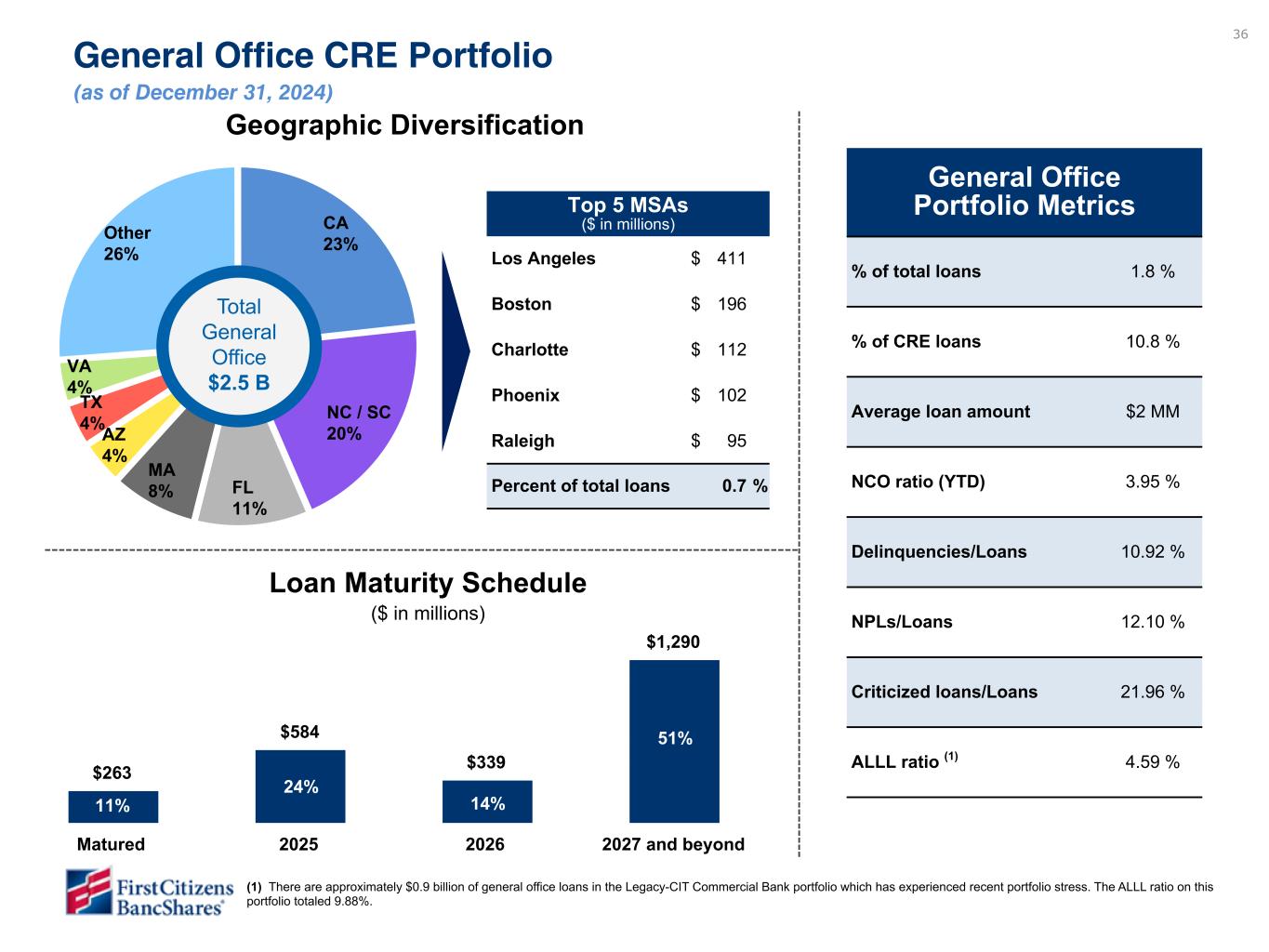 36 $263 $584 $339 $1,290 Matured 2025 2026 2027 and beyond General Office CRE Portfolio (as of December 31, 2024) CA 23% NC / SC 20% FL 11% MA 8% AZ 4% TX 4% VA 4% Other 26% Total General Office $2.5 B Geographic Diversification Loan Maturity Schedule ($ in millions) 11% 24% 14% 51% (1) There are approximately $0.9 billion of general office loans in the Legacy-CIT Commercial Bank portfolio which has experienced recent portfolio stress. The ALLL ratio on this portfolio totaled 9.88%. Top 5 MSAs ($ in millions) Los Angeles $ 411 Boston $ 196 Charlotte $ 112 Phoenix $ 102 Raleigh $ 95 Percent of total loans 0.7 % General Office Portfolio Metrics % of total loans 1.8 % % of CRE loans 10.8 % Average loan amount $2 MM NCO ratio (YTD) 3.95 % Delinquencies/Loans 10.92 % NPLs/Loans 12.10 % Criticized loans/Loans 21.96 % ALLL ratio (1) 4.59 %
