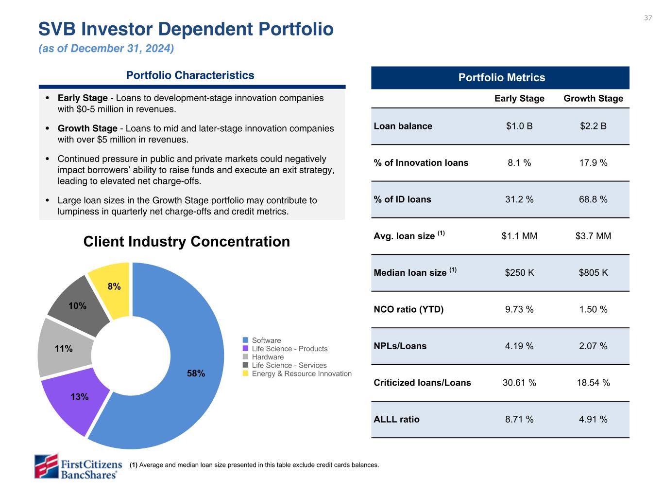 37 SVB Investor Dependent Portfolio (as of December 31, 2024) Portfolio Metrics Early Stage Growth Stage Loan balance $1.0 B $2.2 B % of Innovation loans 8.1 % 17.9 % % of ID loans 31.2 % 68.8 % Avg. loan size (1) $1.1 MM $3.7 MM Median loan size (1) $250 K $805 K NCO ratio (YTD) 9.73 % 1.50 % NPLs/Loans 4.19 % 2.07 % Criticized loans/Loans 30.61 % 18.54 % ALLL ratio 8.71 % 4.91 % Client Industry Concentration Portfolio Characteristics • Early Stage - Loans to development-stage innovation companies with $0-5 million in revenues. • Growth Stage - Loans to mid and later-stage innovation companies with over $5 million in revenues. • Continued pressure in public and private markets could negatively impact borrowers’ ability to raise funds and execute an exit strategy, leading to elevated net charge-offs. • Large loan sizes in the Growth Stage portfolio may contribute to lumpiness in quarterly net charge-offs and credit metrics. 58% 13% 11% 10% 8% Software Life Science - Products Hardware Life Science - Services Energy & Resource Innovation Please do not review - data is not available. To be provided in subsequent draft. Craig - Changed NCO ratio to YTD instead of QTD similar to previous slide per feedback from Robert Hawley and Andy Giangrave (1) Average and median loan size presented in this table exclude credit cards balances.