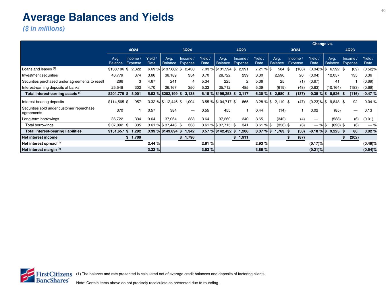 40 Change vs. 4Q24 3Q24 4Q23 3Q24 4Q23 Avg. Balance Income / Expense Yield / Rate Avg. Balance Income / Expense Yield / Rate Avg. Balance Income / Expense Yield / Rate Avg. Balance Income / Expense Yield / Rate Avg. Balance Income / Expense Yield / Rate Loans and leases (1) $ 138,186 $ 2,322 6.69 % $ 137,602 $ 2,430 7.03 % $ 131,594 $ 2,391 7.21 % $ 584 $ (108) (0.34) % $ 6,592 $ (69) (0.52) % Investment securities 40,779 374 3.66 38,189 354 3.70 28,722 239 3.30 2,590 20 (0.04) 12,057 135 0.36 Securities purchased under agreements to resell 266 3 4.67 241 4 5.34 225 2 5.36 25 (1) (0.67) 41 1 (0.69) Interest-earning deposits at banks 25,548 302 4.70 26,167 350 5.33 35,712 485 5.39 (619) (48) (0.63) (10,164) (183) (0.69) Total interest-earning assets (1) $ 204,779 $ 3,001 5.83 % $ 202,199 $ 3,138 6.18 % $ 196,253 $ 3,117 6.30 % $ 2,580 $ (137) -0.35 % $ 8,526 $ (116) -0.47 % Interest-bearing deposits $ 114,565 $ 957 3.32 % $ 112,446 $ 1,004 3.55 % $ 104,717 $ 865 3.28 % $ 2,119 $ (47) (0.23) % $ 9,848 $ 92 0.04 % Securities sold under customer repurchase agreements 370 1 0.57 384 — 0.55 455 1 0.44 (14) 1 0.02 (85) — 0.13 Long-term borrowings 36,722 334 3.64 37,064 338 3.64 37,260 340 3.65 (342) (4) — (538) (6) (0.01) Total borrowings $ 37,092 $ 335 3.61 % $ 37,448 $ 338 3.61 % $ 37,715 $ 341 3.61 % $ (356) $ (3) — % $ (623) $ (6) — % Total interest-bearing liabilities $ 151,657 $ 1,292 3.39 % $ 149,894 $ 1,342 3.57 % $ 142,432 $ 1,206 3.37 % $ 1,763 $ (50) -0.18 % $ 9,225 $ 86 0.02 % Net interest income $ 1,709 $ 1,796 $ 1,911 $ (87) $ (202) Net interest spread (1) 2.44 % 2.61 % 2.93 % (0.17) % (0.49) % Net interest margin (1) 3.32 % 3.53 % 3.86 % (0.21) % (0.54) % Change vs. YTD23 YTD22 YTD22 Avg. Balance Income / Expense Yield / Rate Avg. Balance Income / Expense Yield / Rate Avg. Balance Income / Expense Yield / Rate Loans and leases (1) $ 66,634 $ 2,953 4.41 % $ 65,639 $ 2,697 4.09 % $ 995 $ 256 0.32 % Investment securities 19,166 354 1.85 16,110 216 1.32 3,056 138 0.53 Interest-earning deposits at banks 7,726 106 1.38 13,246 17 0.13 (5,520) 89 1.25 Total interest-earning assets (1) $ 93,526 $ 3,413 3.63 % $ 94,995 $ 2,930 3.07 % $ (1,469) $ 483 0.56 % Interest-bearing deposits $ 63,598 $ 335 0.53 % $ 65,295 $ 239 0.37 % $ (1,697) $ 96 0.16 % Securities sold under customer repurchase agreements 590 1 0.19 660 1 0.20 (70) — (0.01) Other short-term borrowings 824 28 3.30 — — — 824 28 3.30 Long-term borrowings 3,882 103 2.64 5,915 249 4.15 (2,033) (146) (1.51) Total borrowings $ 5,296 $ 132 2.47 % $ 6,575 $ 250 3.75 % $ (1,279) $ (118) (1.28) % Total interest-bearing liabilities $ 68,894 $ 467 0.68 % $ 71,870 $ 489 0.68 % $ (2,976) $ (22) — % Net interest income $ 2,946 $ 2,441 $ 505 Net interest spread (1) 2.95 % 2.39 % 0.56 % Net interest margin (1) 3.14 % 2.55 % 0.59 % Average Balances and Yields ($ in millions) YTD not disclosed Q1 (1) The balance and rate presented is calculated net of average credit balances and deposits of factoring clients. Note: Certain items above do not precisely recalculate as presented due to rounding.