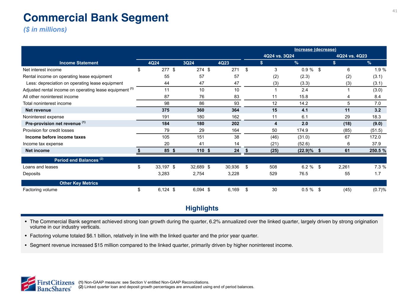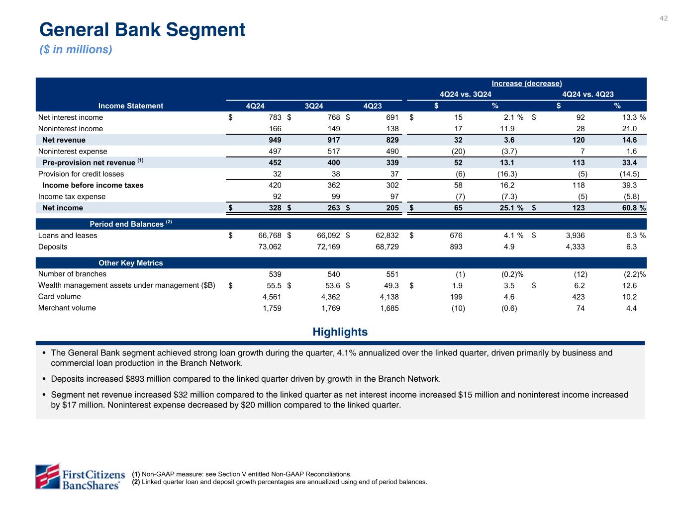 41 Increase (decrease) 4Q24 vs. 3Q24 4Q24 vs. 4Q23 Income Statement 4Q24 3Q24 4Q23 $ % $ % Net interest income $ 277 $ 274 $ 271 $ 3 0.9 % $ 6 1.9 % Rental income on operating lease equipment 55 57 57 (2) (2.3) (2) (3.1) Less: depreciation on operating lease equipment 44 47 47 (3) (3.3) (3) (3.1) Adjusted rental income on operating lease equipment (1) 11 10 10 1 2.4 1 (3.0) All other noninterest income 87 76 83 11 15.8 4 8.4 Total noninterest income 98 86 93 12 14.2 5 7.0 Net revenue 375 360 364 15 4.1 11 3.2 Noninterest expense 191 180 162 11 6.1 29 18.3 Pre-provision net revenue (1) 184 180 202 4 2.0 (18) (9.0) Provision for credit losses 79 29 164 50 174.9 (85) (51.5) Income before income taxes 105 151 38 (46) (31.0) 67 172.0 Income tax expense 20 41 14 (21) (52.6) 6 37.9 Net income $ 85 $ 110 $ 24 $ (25) (22.9) % $ 61 250.5 % Period end Balances (2) Loans and leases $ 33,197 $ 32,689 $ 30,936 $ 508 6.2 % $ 2,261 7.3 % Deposits 3,283 2,754 3,228 529 76.5 55 1.7 Other Key Metrics Factoring volume $ 6,124 $ 6,094 $ 6,169 $ 30 0.5 % $ (45) (0.7) % Highlights • The Commercial Bank segment achieved strong loan growth during the quarter, 6.2% annualized over the linked quarter, largely driven by strong origination volume in our industry verticals. • Factoring volume totaled $6.1 billion, relatively in line with the linked quarter and the prior year quarter. • Segment revenue increased $15 million compared to the linked quarter, primarily driven by higher noninterest income. Commercial Bank Segment ($ in millions) (1) Non-GAAP measure: see Section V entitled Non-GAAP Reconciliations. (2) Linked quarter loan and deposit growth percentages are annualized using end of period balances. Please do not review - data is update based on latest rounded financials but has not yet been validated and data and commentary will be updated in subsequent draft Please do not review commentary. To be provided in subsequent draft. Please do not review - data is not available. To be provided in subsequent draft.
