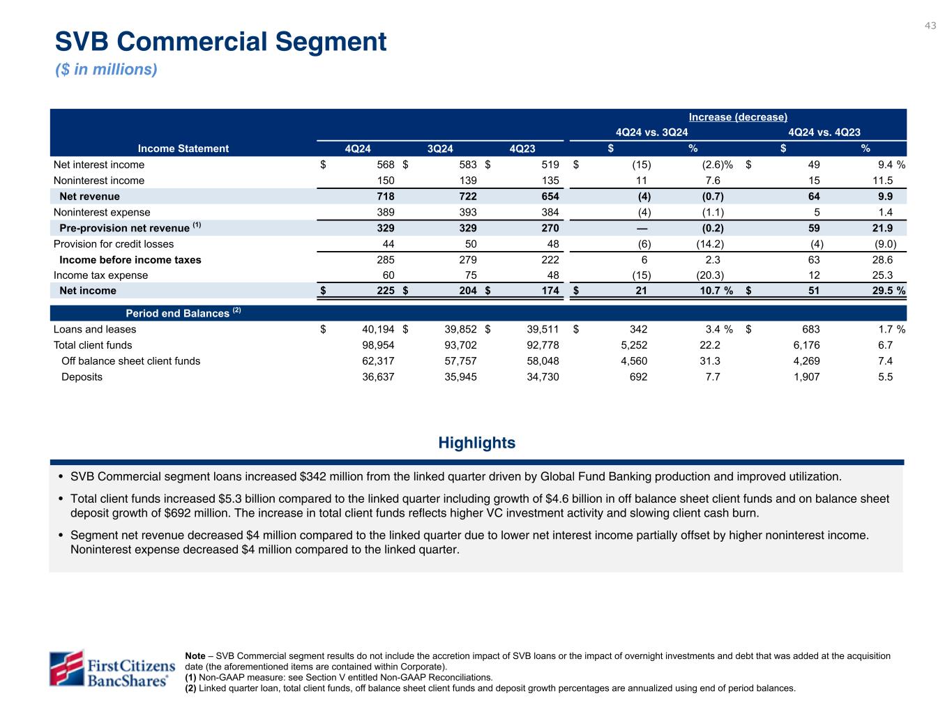43 Increase (decrease) 4Q24 vs. 3Q24 4Q24 vs. 4Q23 Income Statement 4Q24 3Q24 4Q23 $ % $ % Net interest income $ 568 $ 583 $ 519 $ (15) (2.6) % $ 49 9.4 % Noninterest income 150 139 135 11 7.6 15 11.5 Net revenue 718 722 654 (4) (0.7) 64 9.9 Noninterest expense 389 393 384 (4) (1.1) 5 1.4 Pre-provision net revenue (1) 329 329 270 — (0.2) 59 21.9 Provision for credit losses 44 50 48 (6) (14.2) (4) (9.0) Income before income taxes 285 279 222 6 2.3 63 28.6 Income tax expense 60 75 48 (15) (20.3) 12 25.3 Net income $ 225 $ 204 $ 174 $ 21 10.7 % $ 51 29.5 % Period end Balances (2) Loans and leases $ 40,194 $ 39,852 $ 39,511 $ 342 3.4 % $ 683 1.7 % Total client funds 98,954 93,702 92,778 5,252 22.2 6,176 6.7 Off balance sheet client funds 62,317 57,757 58,048 4,560 31.3 4,269 7.4 Deposits 36,637 35,945 34,730 692 7.7 1,907 5.5 SVB Commercial Segment ($ in millions) Note – SVB Commercial segment results do not include the accretion impact of SVB loans or the impact of overnight investments and debt that was added at the acquisition date (the aforementioned items are contained within Corporate). (1) Non-GAAP measure: see Section V entitled Non-GAAP Reconciliations. (2) Linked quarter loan, total client funds, off balance sheet client funds and deposit growth percentages are annualized using end of period balances. Highlights • SVB Commercial segment loans increased $342 million from the linked quarter driven by Global Fund Banking production and improved utilization. • Total client funds increased $5.3 billion compared to the linked quarter including growth of $4.6 billion in off balance sheet client funds and on balance sheet deposit growth of $692 million. The increase in total client funds reflects higher VC investment activity and slowing client cash burn. • Segment net revenue decreased $4 million compared to the linked quarter due to lower net interest income partially offset by higher noninterest income. Noninterest expense decreased $4 million compared to the linked quarter.