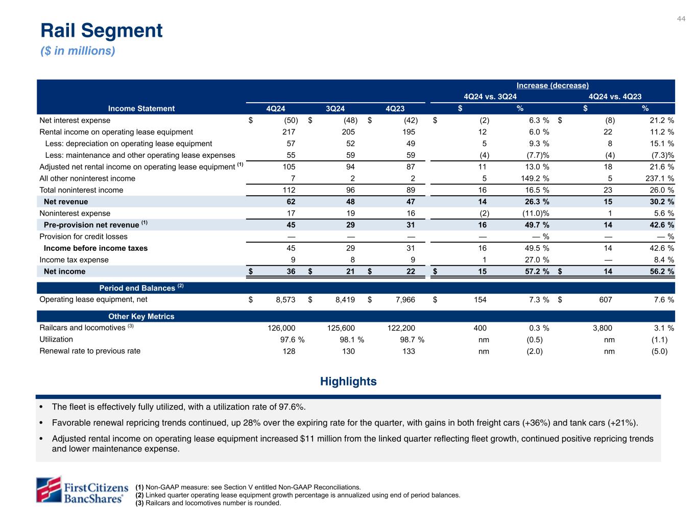 44 Increase (decrease) 4Q24 vs. 3Q24 4Q24 vs. 4Q23 Income Statement 4Q24 3Q24 4Q23 $ % $ % Net interest expense $ (50) $ (48) $ (42) $ (2) 6.3 % $ (8) 21.2 % Rental income on operating lease equipment 217 205 195 12 6.0 % 22 11.2 % Less: depreciation on operating lease equipment 57 52 49 5 9.3 % 8 15.1 % Less: maintenance and other operating lease expenses 55 59 59 (4) (7.7) % (4) (7.3) % Adjusted net rental income on operating lease equipment (1) 105 94 87 11 13.0 % 18 21.6 % All other noninterest income 7 2 2 5 149.2 % 5 237.1 % Total noninterest income 112 96 89 16 16.5 % 23 26.0 % Net revenue 62 48 47 14 26.3 % 15 30.2 % Noninterest expense 17 19 16 (2) (11.0) % 1 5.6 % Pre-provision net revenue (1) 45 29 31 16 49.7 % 14 42.6 % Provision for credit losses — — — — — % — — % Income before income taxes 45 29 31 16 49.5 % 14 42.6 % Income tax expense 9 8 9 1 27.0 % — 8.4 % Net income $ 36 $ 21 $ 22 $ 15 57.2 % $ 14 56.2 % Period end Balances (2) Operating lease equipment, net $ 8,573 $ 8,419 $ 7,966 $ 154 7.3 % $ 607 7.6 % Other Key Metrics Railcars and locomotives (3) 126,000 125,600 122,200 400 0.3 % 3,800 3.1 % Utilization 97.6 % 98.1 % 98.7 % nm (0.5) nm (1.1) Renewal rate to previous rate 128 130 133 nm (2.0) nm (5.0) Rail Segment ($ in millions) (1) Non-GAAP measure: see Section V entitled Non-GAAP Reconciliations. (2) Linked quarter operating lease equipment growth percentage is annualized using end of period balances. (3) Railcars and locomotives number is rounded. Highlights • The fleet is effectively fully utilized, with a utilization rate of 97.6%. • Favorable renewal repricing trends continued, up 28% over the expiring rate for the quarter, with gains in both freight cars (+36%) and tank cars (+21%). • Adjusted rental income on operating lease equipment increased $11 million from the linked quarter reflecting fleet growth, continued positive repricing trends and lower maintenance expense. Please do not review - data is not available. To be provided in subsequent draft.