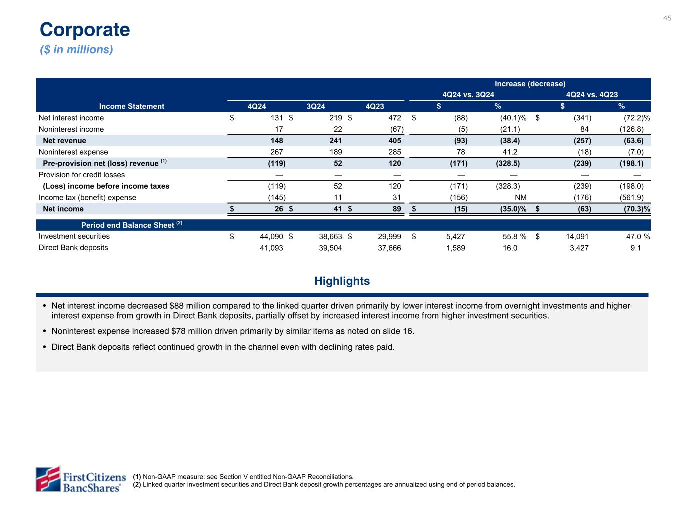 45 Highlights • Net interest income decreased $88 million compared to the linked quarter driven primarily by lower interest income from overnight investments and higher interest expense from growth in Direct Bank deposits, partially offset by increased interest income from higher investment securities. • Noninterest expense increased $78 million driven primarily by similar items as noted on slide 16. • Direct Bank deposits reflect continued growth in the channel even with declining rates paid. Corporate ($ in millions) (1) Non-GAAP measure: see Section V entitled Non-GAAP Reconciliations. (2) Linked quarter investment securities and Direct Bank deposit growth percentages are annualized using end of period balances. Increase (decrease) 4Q24 vs. 3Q24 4Q24 vs. 4Q23 Income Statement 4Q24 3Q24 4Q23 $ % $ % Net interest income $ 131 $ 219 $ 472 $ (88) (40.1) % $ (341) (72.2) % Noninterest income 17 22 (67) (5) (21.1) 84 (126.8) Net revenue 148 241 405 (93) (38.4) (257) (63.6) Noninterest expense 267 189 285 78 41.2 (18) (7.0) Pre-provision net (loss) revenue (1) (119) 52 120 (171) (328.5) (239) (198.1) Provision for credit losses — — — — — — — (Loss) income before income taxes (119) 52 120 (171) (328.3) (239) (198.0) Income tax (benefit) expense (145) 11 31 (156) NM (176) (561.9) Net income $ 26 $ 41 $ 89 $ (15) (35.0) % $ (63) (70.3) % Period end Balance Sheet (2) Investment securities $ 44,090 $ 38,663 $ 29,999 $ 5,427 55.8 % $ 14,091 47.0 % Direct Bank deposits 41,093 39,504 37,666 1,589 16.0 3,427 9.1 Highlighted commentary subject to change Please do not review - data is not available. To be provided in subsequent draft.