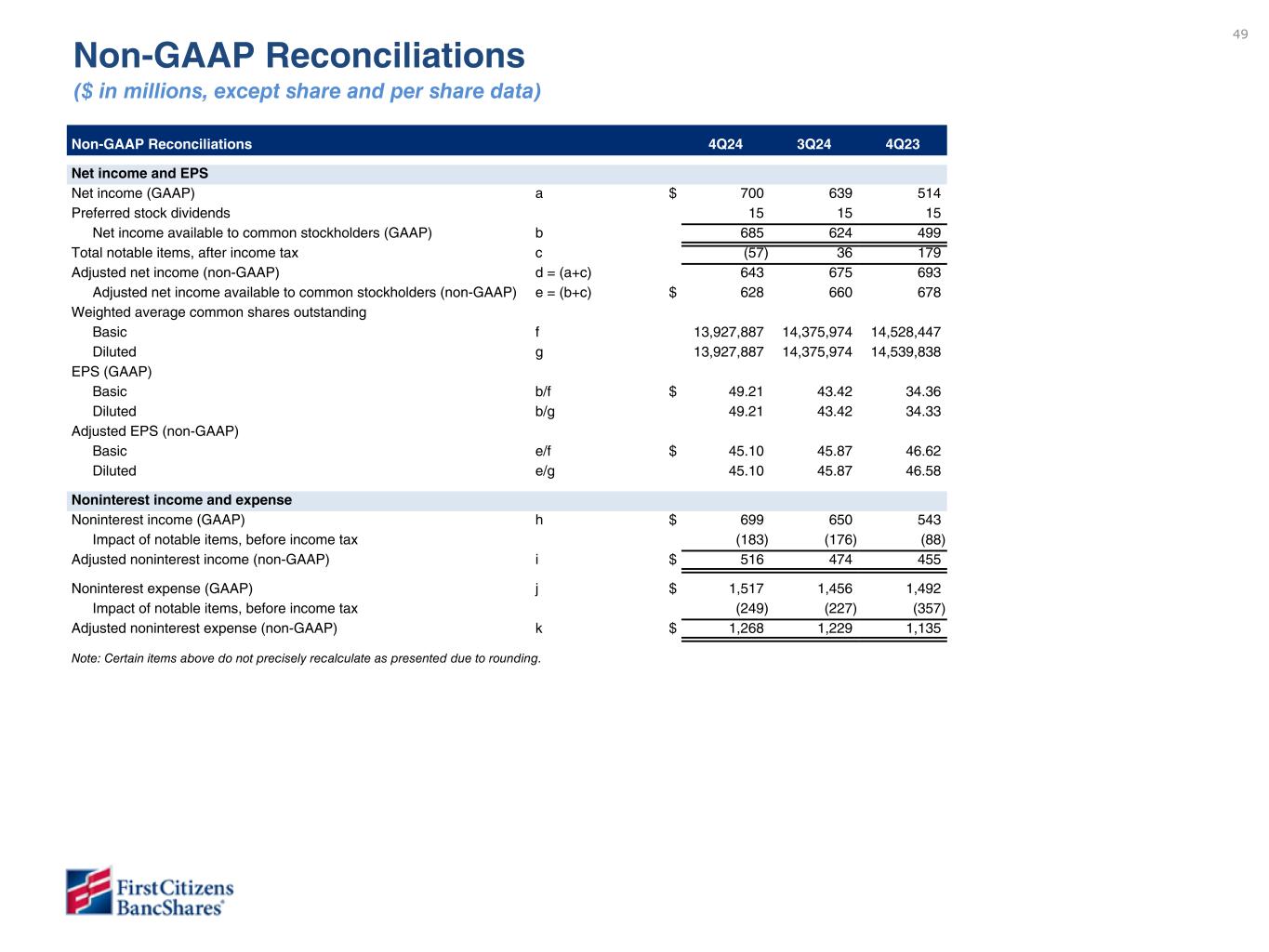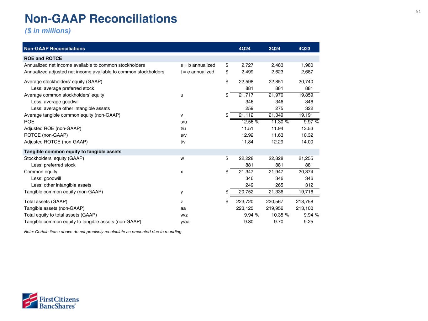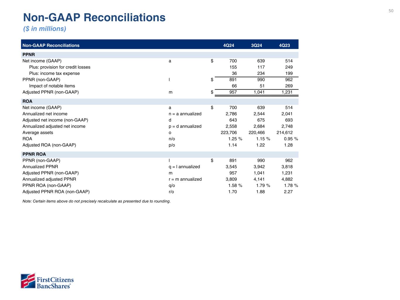 49 Non-GAAP Reconciliations 4Q24 3Q24 4Q23 Net income and EPS Net income (GAAP) a $ 700 639 514 Preferred stock dividends 15 15 15 Net income available to common stockholders (GAAP) b 685 624 499 Total notable items, after income tax c (57) 36 179 Adjusted net income (non-GAAP) d = (a+c) 643 675 693 Adjusted net income available to common stockholders (non-GAAP) e = (b+c) $ 628 660 678 Weighted average common shares outstanding Basic f 13,927,887 14,375,974 14,528,447 Diluted g 13,927,887 14,375,974 14,539,838 EPS (GAAP) Basic b/f $ 49.21 43.42 34.36 Diluted b/g 49.21 43.42 34.33 Adjusted EPS (non-GAAP) Basic e/f $ 45.10 45.87 46.62 Diluted e/g 45.10 45.87 46.58 Noninterest income and expense Noninterest income (GAAP) h $ 699 650 543 Impact of notable items, before income tax (183) (176) (88) Adjusted noninterest income (non-GAAP) i $ 516 474 455 Noninterest expense (GAAP) j $ 1,517 1,456 1,492 Impact of notable items, before income tax (249) (227) (357) Adjusted noninterest expense (non-GAAP) k $ 1,268 1,229 1,135 Note: Certain items above do not precisely recalculate as presented due to rounding. Non-GAAP Reconciliations ($ in millions, except share and per share data)