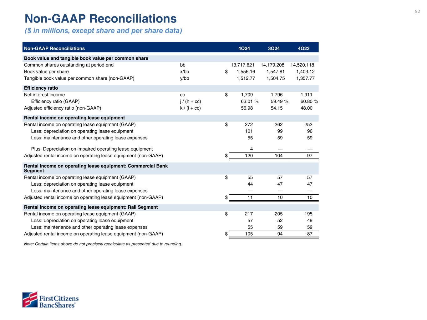 52 Non-GAAP Reconciliations ($ in millions, except share and per share data) Non-GAAP Reconciliations 4Q24 3Q24 4Q23 Book value and tangible book value per common share Common shares outstanding at period end bb 13,717,621 14,179,208 14,520,118 Book value per share x/bb $ 1,556.16 1,547.81 1,403.12 Tangible book value per common share (non-GAAP) y/bb 1,512.77 1,504.75 1,357.77 Efficiency ratio Net interest income cc $ 1,709 1,796 1,911 Efficiency ratio (GAAP) j / (h + cc) 63.01 % 59.49 % 60.80 % Adjusted efficiency ratio (non-GAAP) k / (i + cc) 56.98 54.15 48.00 Rental income on operating lease equipment Rental income on operating lease equipment (GAAP) $ 272 262 252 Less: depreciation on operating lease equipment 101 99 96 Less: maintenance and other operating lease expenses 55 59 59 Plus: Depreciation on impaired operating lease equipment 4 — — Adjusted rental income on operating lease equipment (non-GAAP) $ 120 104 97 Rental income on operating lease equipment: Commercial Bank Segment Rental income on operating lease equipment (GAAP) $ 55 57 57 Less: depreciation on operating lease equipment 44 47 47 Less: maintenance and other operating lease expenses — — — Adjusted rental income on operating lease equipment (non-GAAP) $ 11 10 10 Rental income on operating lease equipment: Rail Segment Rental income on operating lease equipment (GAAP) $ 217 205 195 Less: depreciation on operating lease equipment 57 52 49 Less: maintenance and other operating lease expenses 55 59 59 Adjusted rental income on operating lease equipment (non-GAAP) $ 105 94 87 Note: Certain items above do not precisely recalculate as presented due to rounding.