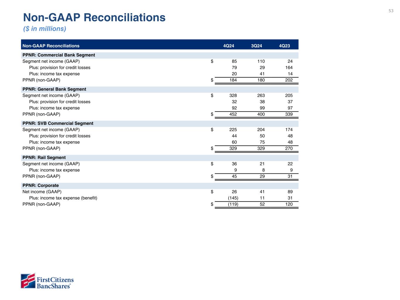 53 Non-GAAP Reconciliations ($ in millions) Non-GAAP Reconciliations 4Q24 3Q24 4Q23 PPNR: Commercial Bank Segment Segment net income (GAAP) $ 85 110 24 Plus: provision for credit losses 79 29 164 Plus: income tax expense 20 41 14 PPNR (non-GAAP) $ 184 180 202 PPNR: General Bank Segment Segment net income (GAAP) $ 328 263 205 Plus: provision for credit losses 32 38 37 Plus: income tax expense 92 99 97 PPNR (non-GAAP) $ 452 400 339 PPNR: SVB Commercial Segment Segment net income (GAAP) $ 225 204 174 Plus: provision for credit losses 44 50 48 Plus: income tax expense 60 75 48 PPNR (non-GAAP) $ 329 329 270 PPNR: Rail Segment Segment net income (GAAP) $ 36 21 22 Plus: income tax expense 9 8 9 PPNR (non-GAAP) $ 45 29 31 PPNR: Corporate Net income (GAAP) $ 26 41 89 Plus: income tax expense (benefit) (145) 11 31 PPNR (non-GAAP) $ (119) 52 120