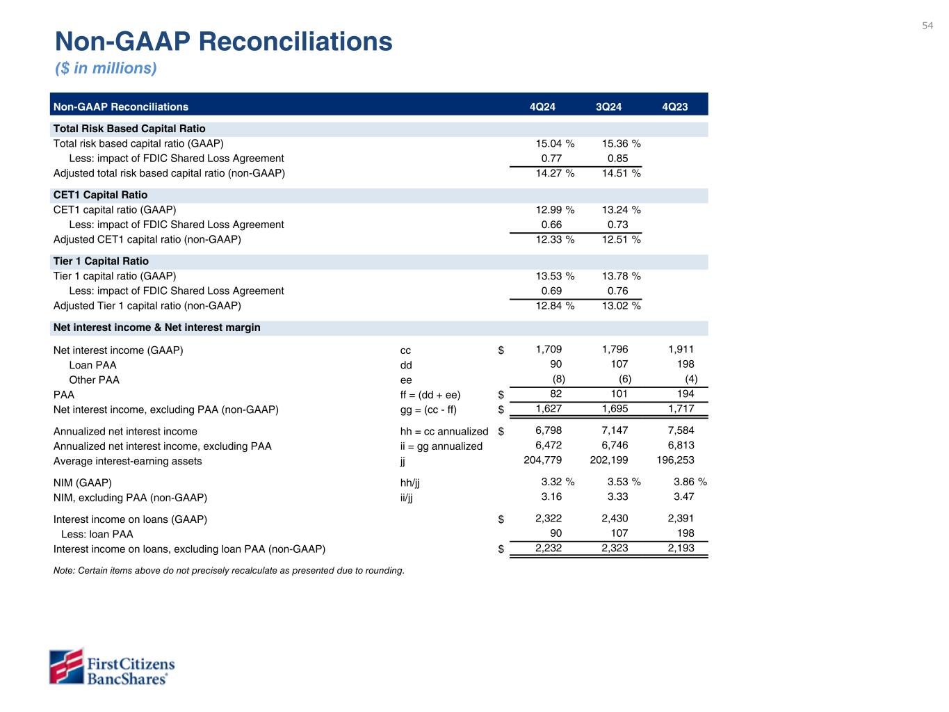 54 Non-GAAP Reconciliations ($ in millions) Non-GAAP Reconciliations 4Q24 3Q24 4Q23 Total Risk Based Capital Ratio Total risk based capital ratio (GAAP) 15.04 % 15.36 % Less: impact of FDIC Shared Loss Agreement 0.77 0.85 Adjusted total risk based capital ratio (non-GAAP) 14.27 % 14.51 % CET1 Capital Ratio CET1 capital ratio (GAAP) 12.99 % 13.24 % Less: impact of FDIC Shared Loss Agreement 0.66 0.73 Adjusted CET1 capital ratio (non-GAAP) 12.33 % 12.51 % Tier 1 Capital Ratio Tier 1 capital ratio (GAAP) 13.53 % 13.78 % Less: impact of FDIC Shared Loss Agreement 0.69 0.76 Adjusted Tier 1 capital ratio (non-GAAP) 12.84 % 13.02 % Net interest income & Net interest margin Net interest income (GAAP) cc $ 1,709 1,796 1,911 Loan PAA dd 90 107 198 Other PAA ee (8) (6) (4) PAA ff = (dd + ee) $ 82 101 194 Net interest income, excluding PAA (non-GAAP) gg = (cc - ff) $ 1,627 1,695 1,717 Annualized net interest income hh = cc annualized $ 6,798 7,147 7,584 Annualized net interest income, excluding PAA ii = gg annualized 6,472 6,746 6,813 Average interest-earning assets jj 204,779 202,199 196,253 NIM (GAAP) hh/jj 3.32 % 3.53 % 3.86 % NIM, excluding PAA (non-GAAP) ii/jj 3.16 3.33 3.47 Interest income on loans (GAAP) $ 2,322 2,430 2,391 Less: loan PAA 90 107 198 Interest income on loans, excluding loan PAA (non-GAAP) $ 2,232 2,323 2,193 Note: Certain items above do not precisely recalculate as presented due to rounding.