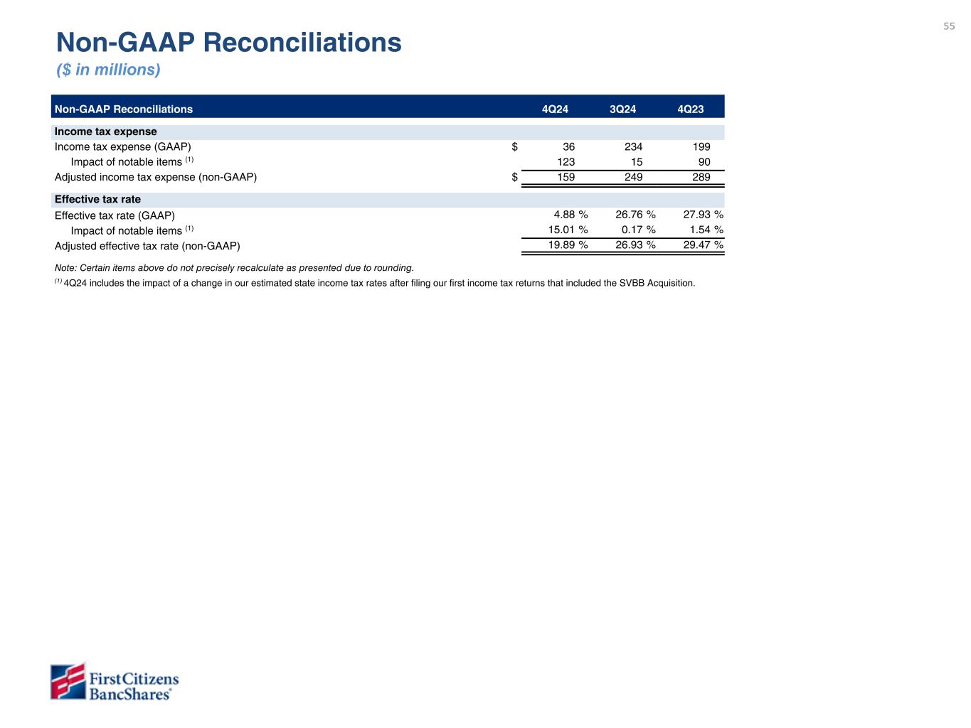 55 Non-GAAP Reconciliations ($ in millions) Non-GAAP Reconciliations 4Q24 3Q24 4Q23 Income tax expense Income tax expense (GAAP) $ 36 234 199 Impact of notable items (1) 123 15 90 Adjusted income tax expense (non-GAAP) $ 159 249 289 Effective tax rate Effective tax rate (GAAP) 4.88 % 26.76 % 27.93 % Impact of notable items (1) 15.01 % 0.17 % 1.54 % Adjusted effective tax rate (non-GAAP) 19.89 % 26.93 % 29.47 % Note: Certain items above do not precisely recalculate as presented due to rounding. (1) 4Q24 includes the impact of a change in our estimated state income tax rates after filing our first income tax returns that included the SVBB Acquisition.