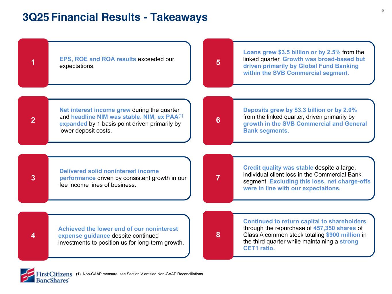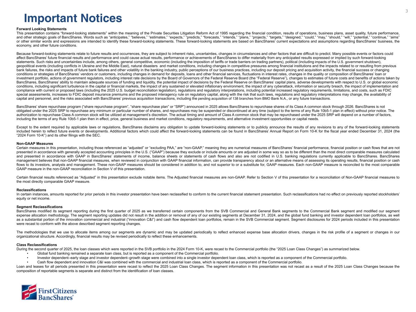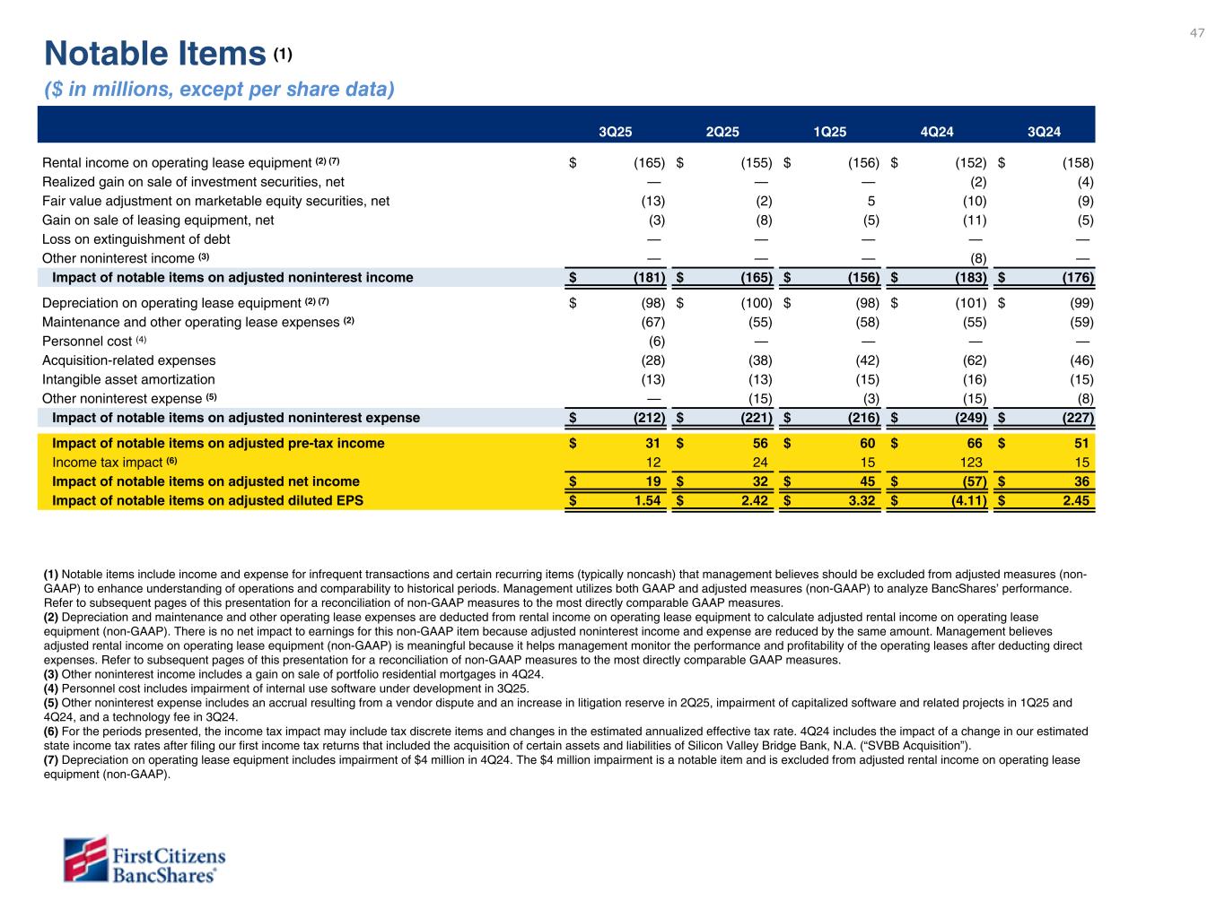 47 1Q23 4Q22 1Q22 Rental income on operating lease equipment (2) $ (165) $ (155) $ (158) Realized gain on sale of investment securities available for sale, net — — (4) Fair value adjustment on marketable equity securities, net (13) (2) (9) Gain on sale of leasing equipment, net (3) (8) (5) Gain on acquisition — — — Gain on extinguishment of debt — — — Other noninterest income(3) — — — Impact on adjusted noninterest income $ (181) $ (165) $ (176) Depreciation on operating lease equipment (2) $ (98) $ (100) $ (99) Maintenance and other operating lease expenses (2) (67) (55) (59) Salaries and benefits (6) — — Acquisition-related expenses (28) (38) (46) Intangible asset amortization (13) (13) (15) Other noninterest expense (4) — (15) (8) Impact on adjusted noninterest expense $ (212) $ (221) $ (227) CECL Day 2 provision and reserve for unfunded commitments — (716) — Provision for credit losses- investment securities available for sale — (4) — Provision for credit losses - total adjustments $ — $ — $ — Impact on adjusted pre-tax income $ 134 $ 173 $ 38 Income tax impact (5) (6) 12 24 15 Impact on adjusted net income $ 19 $ 32 $ 36 Impact on adjusted diluted EPS $ 1.54 $ 2.42 2.45 Notable Items (1) ($ in millions, except per share data) 3Q25 2Q25 1Q25 4Q24 3Q24 Rental income on operating lease equipment (2) (7) $ (165) $ (155) $ (156) $ (152) $ (158) Realized gain on sale of investment securities, net — — — (2) (4) Fair value adjustment on marketable equity securities, net (13) (2) 5 (10) (9) Gain on sale of leasing equipment, net (3) (8) (5) (11) (5) Loss on extinguishment of debt — — — — — Other noninterest income (3) — — — (8) — Impact of notable items on adjusted noninterest income $ (181) $ (165) $ (156) $ (183) $ (176) Depreciation on operating lease equipment (2) (7) $ (98) $ (100) $ (98) $ (101) $ (99) Maintenance and other operating lease expenses (2) (67) (55) (58) (55) (59) Personnel cost (4) (6) — — — — Acquisition-related expenses (28) (38) (42) (62) (46) Intangible asset amortization (13) (13) (15) (16) (15) Other noninterest expense (5) — (15) (3) (15) (8) Impact of notable items on adjusted noninterest expense $ (212) $ (221) $ (216) $ (249) $ (227) Impact of notable items on adjusted pre-tax income $ 31 $ 56 $ 60 $ 66 $ 51 Income tax impact (6) 12 24 15 123 15 Impact of notable items on adjusted net income $ 19 $ 32 $ 45 $ (57) $ 36 Impact of notable items on adjusted diluted EPS $ 1.54 $ 2.42 $ 3.32 $ (4.11) $ 2.45 (1) Notable items include income and expense for infrequent transactions and certain recurring items (typically noncash) that management believes should be excluded from adjusted measures (non- GAAP) to enhance understanding of operations and comparability to historical periods. Management utilizes both GAAP and adjusted measures (non-GAAP) to analyze BancShares’ performance. Refer to subsequent pages of this presentation for a reconciliation of non-GAAP measures to the most directly comparable GAAP measures. (2) Depreciation and maintenance and other operating lease expenses are deducted from rental income on operating lease equipment to calculate adjusted rental income on operating lease equipment (non-GAAP). There is no net impact to earnings for this non-GAAP item because adjusted noninterest income and expense are reduced by the same amount. Management believes adjusted rental income on operating lease equipment (non-GAAP) is meaningful because it helps management monitor the performance and profitability of the operating leases after deducting direct expenses. Refer to subsequent pages of this presentation for a reconciliation of non-GAAP measures to the most directly comparable GAAP measures. (3) Other noninterest income includes a gain on sale of portfolio residential mortgages in 4Q24. (4) Personnel cost includes impairment of internal use software under development in 3Q25. (5) Other noninterest expense includes an accrual resulting from a vendor dispute and an increase in litigation reserve in 2Q25, impairment of capitalized software and related projects in 1Q25 and 4Q24, and a technology fee in 3Q24. (6) For the periods presented, the income tax impact may include tax discrete items and changes in the estimated annualized effective tax rate. 4Q24 includes the impact of a change in our estimated state income tax rates after filing our first income tax returns that included the acquisition of certain assets and liabilities of Silicon Valley Bridge Bank, N.A. (“SVBB Acquisition”). (7) Depreciation on operating lease equipment includes impairment of $4 million in 4Q24. The $4 million impairment is a notable item and is excluded from adjusted rental income on operating lease equipment (non-GAAP). Non-GAAP materials are under review and will be provided in subsequent draft