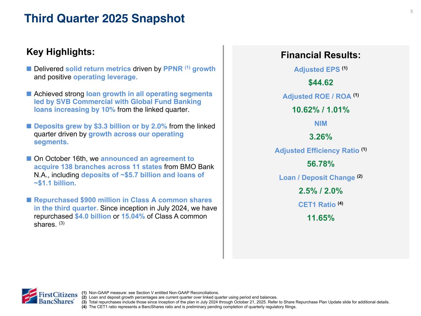 3 Forward Looking Statements This presentation contains “forward-looking statements” within the meaning of the Private Securities Litigation Reform Act of 1995 regarding the financial condition, results of operations, business plans, asset quality, future performance, and other strategic goals of BancShares. Words such as “anticipates,” “believes,” “estimates,” “expects,” “predicts,” “forecasts,” “intends,” “plans,” “projects,” “targets,” “designed,” “could,” “may,” “should,” “will,” “potential,” “continue,” “aims” or other similar words and expressions are intended to identify these forward-looking statements. These forward-looking statements are based on BancShares’ current expectations and assumptions regarding BancShares’ business, the economy, and other future conditions. Because forward-looking statements relate to future results and occurrences, they are subject to inherent risks, uncertainties, changes in circumstances and other factors that are difficult to predict. Many possible events or factors could affect BancShares’ future financial results and performance and could cause actual results, performance or achievements of BancShares to differ materially from any anticipated results expressed or implied by such forward-looking statements. Such risks and uncertainties include, among others, general competitive, economic (including the imposition of tariffs or trade barriers on trading partners), political (including impacts of the U.S. government shutdown), geopolitical events (including conflicts in Ukraine and the Middle East), natural disasters and market conditions, including changes in competitive pressures among financial institutions and the impacts related to or resulting from previous bank failures, the risks and impacts of future bank failures and other volatility in the banking industry, public perceptions of our business practices, including our deposit pricing and acquisition activity, the financial success or changing conditions or strategies of BancShares’ vendors or customers, including changes in demand for deposits, loans and other financial services, fluctuations in interest rates, changes in the quality or composition of BancShares’ loan or investment portfolio, actions of government regulators, including interest rate decisions by the Board of Governors of the Federal Reserve Board (the “Federal Reserve”), changes to estimates of future costs and benefits of actions taken by BancShares, BancShares’ ability to maintain adequate sources of funding and liquidity, the potential impact of decisions by the Federal Reserve on BancShares’ capital plans, adverse developments with respect to U.S. or global economic conditions, including significant turbulence in the capital or financial markets, the impact of any sustained or elevated inflationary environment, the impact of any cyberattack, information or security breach, the impact of implementation and compliance with current or proposed laws (including the 2025 U.S. budget reconciliation legislation), regulations and regulatory interpretations, including potential increased regulatory requirements, limitations, and costs, such as FDIC special assessments, increases to FDIC deposit insurance premiums and the proposed interagency rule on regulatory capital, along with the risk that such laws, regulations and regulatory interpretations may change, the availability of capital and personnel, and the risks associated with BancShares’ previous acquisition transactions, including the pending acquisition of 138 branches from BMO Bank N.A., or any future transactions. BancShares’ share repurchase program (“share repurchase program”, “share repurchase plan” or “SRP”) announced in 2025 allows BancShares to repurchase shares of its Class A common stock through 2026. BancShares is not obligated under the 2025 SRP to repurchase any minimum or particular number of shares, and repurchases may be suspended or discontinued at any time (subject to the terms of any Rule 10b5-1 plan in effect) without prior notice. The authorization to repurchase Class A common stock will be utilized at management’s discretion. The actual timing and amount of Class A common stock that may be repurchased under the 2025 SRP will depend on a number of factors, including the terms of any Rule 10b5-1 plan then in effect, price, general business and market conditions, regulatory requirements, and alternative investment opportunities or capital needs. Except to the extent required by applicable laws or regulations, BancShares disclaims any obligation to update forward-looking statements or to publicly announce the results of any revisions to any of the forward-looking statements included herein to reflect future events or developments. Additional factors which could affect the forward-looking statements can be found in BancShares’ Annual Report on Form 10-K for the fiscal year ended December 31, 2024 (the “2024 Form 10-K”) and its other filings with the SEC. Non-GAAP Measures Certain measures in this presentation, including those referenced as “adjusted” or “excluding PAA,” are “non-GAAP,” meaning they are numerical measures of BancShares’ financial performance, financial position or cash flows that are not presented in accordance with generally accepted accounting principles in the U.S. (“GAAP”) because they exclude or include amounts or are adjusted in some way so as to be different than the most direct comparable measures calculated and presented in accordance with GAAP in BancShares’ statements of income, balance sheets or statements of cash flows and also are not codified in U.S. banking regulations currently applicable to BancShares. BancShares management believes that non-GAAP financial measures, when reviewed in conjunction with GAAP financial information, can provide transparency about or an alternative means of ass