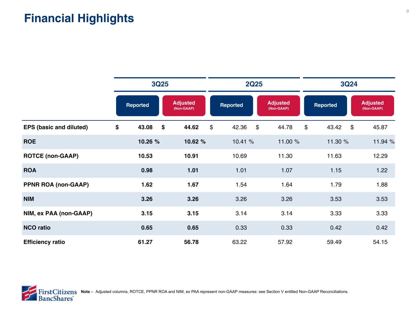 8 3Q25 Financial Results - Takeaways EPS, ROE and ROA results exceeded our expectations. 1 Credit quality was stable despite a large, individual client loss in the Commercial Bank segment. Excluding this loss, net charge-offs were in line with our expectations. 7 Deposits grew by $3.3 billion or by 2.0% from the linked quarter, driven primarily by growth in the SVB Commercial and General Bank segments. 6 Net interest income grew during the quarter and headline NIM was stable. NIM, ex PAA(1) expanded by 1 basis point driven primarily by lower deposit costs. 2 Delivered solid noninterest income performance driven by consistent growth in our fee income lines of business. 3 Loans grew $3.5 billion or by 2.5% from the linked quarter. Growth was broad-based but driven primarily by Global Fund Banking within the SVB Commercial segment. 5 While NII declined during the quarter as anticipated, it was aligned with our expectations. 1 Continued to maintain strong CET1 ratio while repurchasing $613 million in Class A common shares during 3Q25, bringing total repurchases since plan inception to $4.0 billion. 7 Credit quality remained stable, with no emerging problems outside of pressure points previously disclosed in the investor dependent, general office, and equipment finance portfolios. 6 Delivered solid noninterest income performance driven primarily by our Rail and commercial banking segments. 2 Continued to invest in talent, technology and risk infrastructure while realizing the lower end of our noninterest expense guidance. 3 Deposits grew by $3.3 billion or by 2.0% over the linked quarter exceeding our guidance, driven by growth in all of our operating segments. 5 Achieved broad-based loan growth in all of our operating segments, with balances up $3.5 billion or by 2.5% over the linked quarter. 4 Achieved the lower end of our noninterest expense guidance despite continued investments to position us for long-term growth. 4 (1) Non-GAAP measure: see Section V entitled Non-GAAP Reconciliations. Continued to return capital to shareholders through the repurchase of 457,350 shares of Class A common stock totaling $900 million in the third quarter while maintaining a strong CET1 ratio. 8