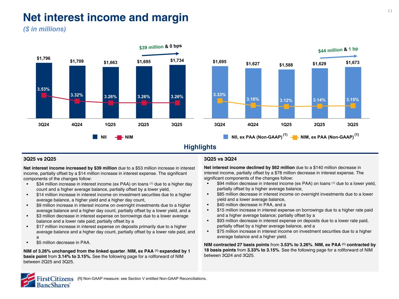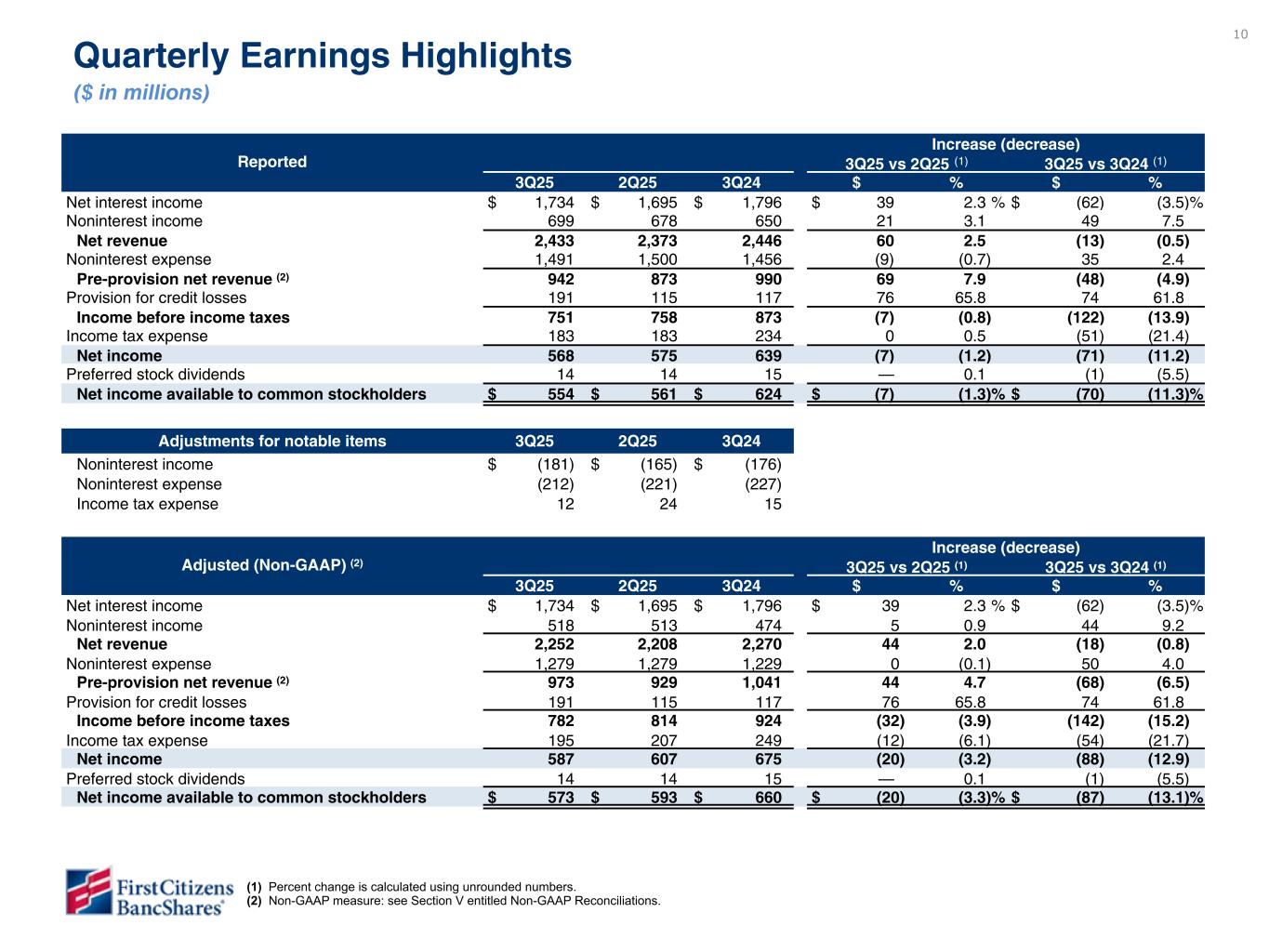 10 Reported Increase (decrease) 3Q25 vs 2Q25 (1) 3Q25 vs 3Q24 (1) 3Q25 2Q25 3Q24 $ % $ % Net interest income $ 1,734 $ 1,695 $ 1,796 $ 39 2.3 % $ (62) (3.5) % Noninterest income 699 678 650 21 3.1 49 7.5 Net revenue 2,433 2,373 2,446 60 2.5 (13) (0.5) Noninterest expense 1,491 1,500 1,456 (9) (0.7) 35 2.4 Pre-provision net revenue (2) 942 873 990 69 7.9 (48) (4.9) Provision for credit losses 191 115 117 76 65.8 74 61.8 Income before income taxes 751 758 873 (7) (0.8) (122) (13.9) Income tax expense 183 183 234 0 0.5 (51) (21.4) Net income 568 575 639 (7) (1.2) (71) (11.2) Preferred stock dividends 14 14 15 — 0.1 (1) (5.5) Net income available to common stockholders $ 554 $ 561 $ 624 $ (7) (1.3) % $ (70) (11.3) % Adjustments for notable items 3Q25 2Q25 3Q24 Noninterest income $ (181) $ (165) $ (176) Noninterest expense (212) (221) (227) Income tax expense 12 24 15 Adjusted (Non-GAAP) (2) Increase (decrease) 3Q25 vs 2Q25 (1) 3Q25 vs 3Q24 (1) 3Q25 2Q25 3Q24 $ % $ % Net interest income $ 1,734 $ 1,695 $ 1,796 $ 39 2.3 % $ (62) (3.5) % Noninterest income 518 513 474 5 0.9 44 9.2 Net revenue 2,252 2,208 2,270 44 2.0 (18) (0.8) Noninterest expense 1,279 1,279 1,229 0 (0.1) 50 4.0 Pre-provision net revenue (2) 973 929 1,041 44 4.7 (68) (6.5) Provision for credit losses 191 115 117 76 65.8 74 61.8 Income before income taxes 782 814 924 (32) (3.9) (142) (15.2) Income tax expense 195 207 249 (12) (6.1) (54) (21.7) Net income 587 607 675 (20) (3.2) (88) (12.9) Preferred stock dividends 14 14 15 — 0.1 (1) (5.5) Net income available to common stockholders $ 573 $ 593 $ 660 $ (20) (3.3) % $ (87) (13.1) % Quarterly Earnings Highlights ($ in millions) (1) Percent change is calculated using unrounded numbers. (2) Non-GAAP measure: see Section V entitled Non-GAAP Reconciliations.