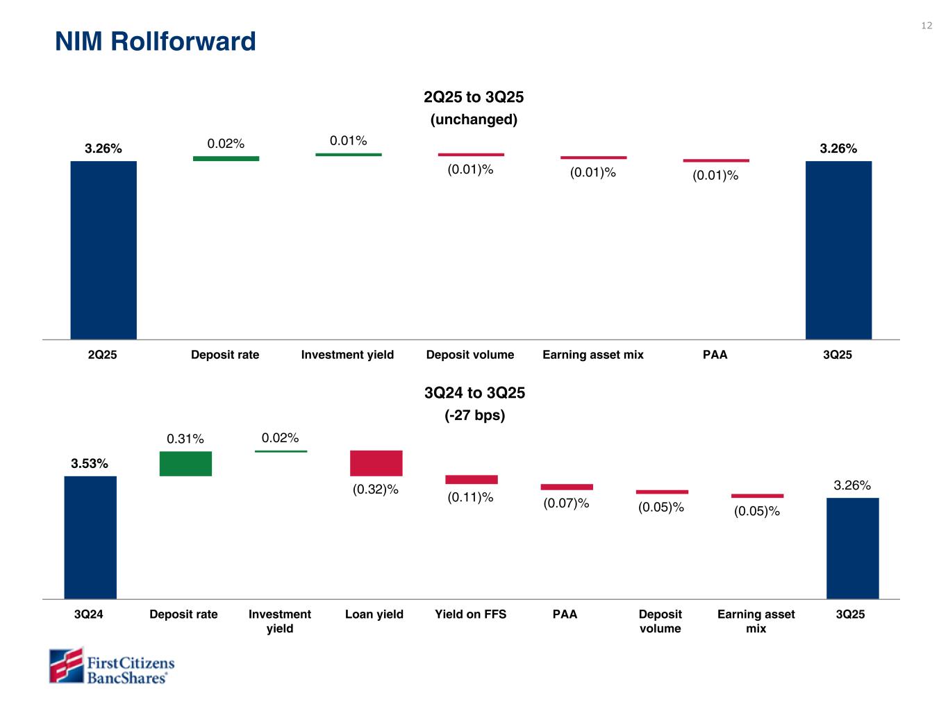11 $1,695 $1,627 $1,588 $1,629 $1,673 3.33% 3.16% 3.12% 3.14% 3.15% NII, ex PAA (Non-GAAP) NIM, ex PAA (Non-GAAP) 3Q24 4Q24 1Q25 2Q25 3Q25 $1,796 $1,709 $1,663 $1,695 $1,734 3.53% 3.32% 3.26% 3.26% 3.26% NII NIM 3Q24 4Q24 1Q25 2Q25 3Q25 $2,441 $2,946 2.55% 3.14% YTD Dec 21 YTD Dec 22 YTD December 2022 vs YTD December 2021 Net interest income increased by $505 million due to a $483 million increase in interest income and a $22 million decrease in interest expense. The change in net interest income was primarily due to the following: ◦ $256 million increase on interest income on loans due to a higher yield and growth offset by lower SBA- PPP interest and fee income and lower accretion income, ◦ $138 million increase in interest income on investment securities due to higher yield and average balance, ◦ $118 million decline in interest expense on borrowings due to a lower rate and average balance, ◦ $89 million increase in interest income on overnight investments due to a higher yield despite a lower average balance; partially offset by a ◦ $96 million increase in interest expense on deposits due to a higher rate paid. NIM expanded from 2.55% to 3.14%. $505 million & 59 bps Highlights $39 million & 0 bps Net interest income and margin ($ in millions) $44 million & 1 bp 3Q25 vs 2Q25 Net interest income increased by $39 million due to a $53 million increase in interest income, partially offset by a $14 million increase in interest expense. The significant components of the changes follow: • $34 million increase in interest income (ex PAA) on loans (1) due to a higher day count and a higher average balance, partially offset by a lower yield, • $14 million increase in interest income on investment securities due to a higher average balance, a higher yield and a higher day count, • $9 million increase in interest income on overnight investments due to a higher average balance and a higher day count, partially offset by a lower yield, and a • $3 million decrease in interest expense on borrowings due to a lower average balance and a lower rate paid; partially offset by a • $17 million increase in interest expense on deposits primarily due to a higher average balance and a higher day count, partially offset by a lower rate paid, and a • $5 million decrease in PAA. NIM of 3.26% unchanged from the linked quarter. NIM, ex PAA (1) expanded by 1 basis point from 3.14% to 3.15%. See the following page for a rollforward of NIM between 2Q25 and 3Q25. 3Q25 vs 3Q24 Net interest income declined by $62 million due to a $140 million decrease in interest income, partially offset by a $78 million decrease in interest expense. The significant components of the changes follow: • $94 million decrease in interest income (ex PAA) on loans (1) due to a lower yield, partially offset by a higher average balance, • $85 million decrease in interest income on overnight investments due to a lower yield and a lower average balance, • $40 million decrease in PAA, and a • $15 million increase in interest expense on borrowings due to a higher rate paid and a higher average balance; partially offset by a • $93 million decrease in interest expense on deposits due to a lower rate paid, partially offset by a higher average balance, and a • $75 million increase in interest income on investment securities due to a higher average balance and a higher yield. NIM contracted 27 basis points from 3.53% to 3.26%. NIM, ex PAA (1) contracted by 18 basis points from 3.33% to 3.15%. See the following page for a rollforward of NIM between 3Q24 and 3Q25. (1) Non-GAAP measure: see Section V entitled Non-GAAP Reconciliations. (1) (1) Craig - We included the day count impact in overnight investments and investment securities as requested but have left off of borrowings as this had an immaterial impact (see Responses file for more information). Note that day count accounts for ~50% of the loan income change and more like 25% for overnights and investment securities.