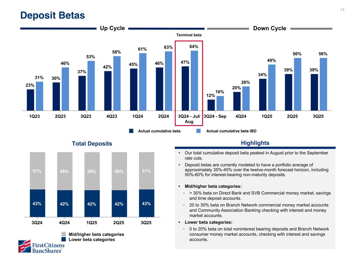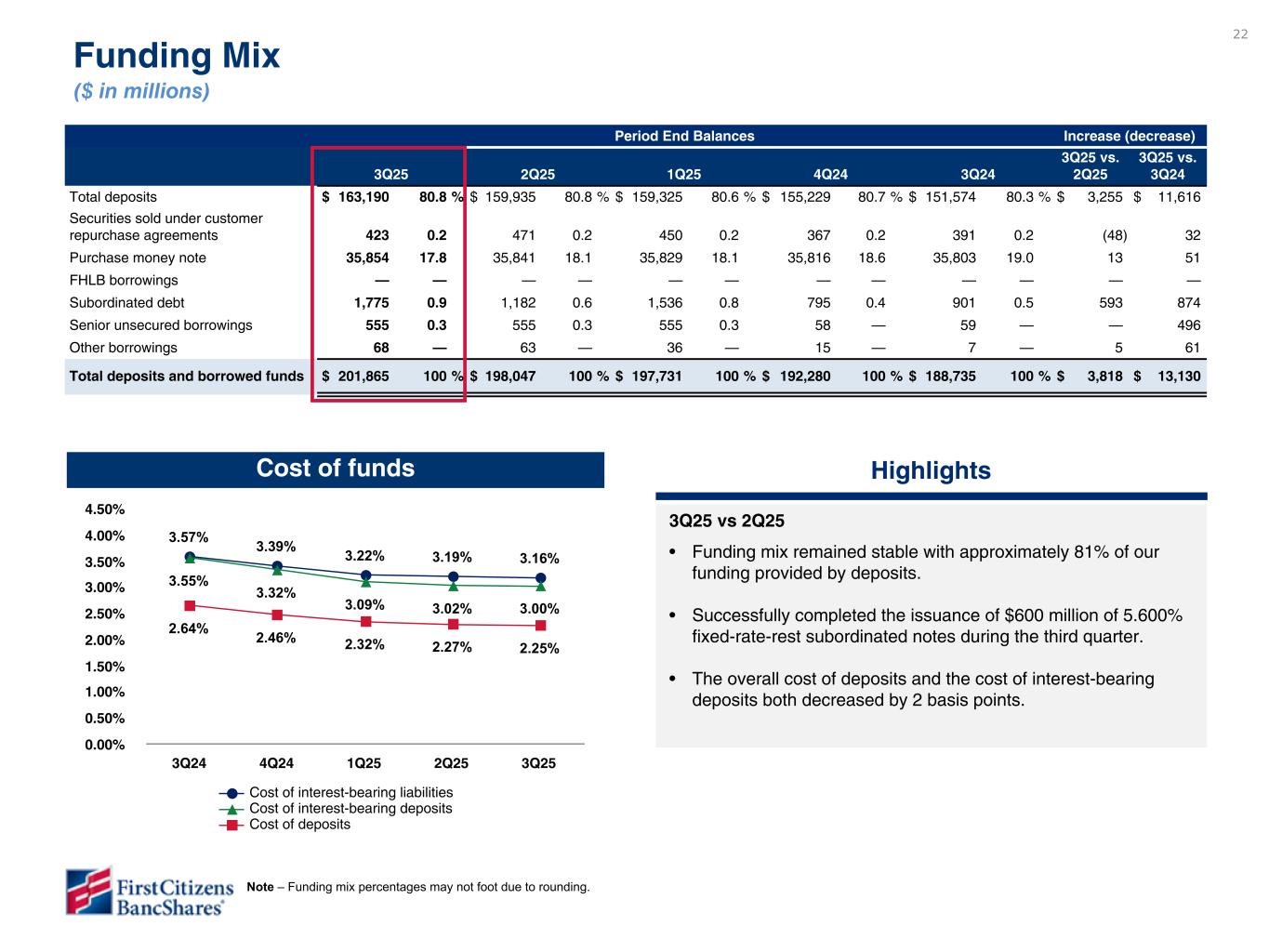 22 3.57% 3.39% 3.22% 3.19% 3.16% 3.55% 3.32% 3.09% 3.02% 3.00% 2.64% 2.46% 2.32% 2.27% 2.25% Cost of interest-bearing liabilities Cost of interest-bearing deposits Cost of deposits 3Q24 4Q24 1Q25 2Q25 3Q25 0.00% 0.50% 1.00% 1.50% 2.00% 2.50% 3.00% 3.50% 4.00% 4.50% Cost of funds Additional sources of liquidity Categories $ in millions FHLB $ 9,218 FRB 4,203 Line of credit 100 Total $ 13,521 Period End Balances Increase (decrease) 3Q25 2Q25 1Q25 4Q24 3Q24 3Q25 vs. 2Q25 3Q25 vs. 3Q24 Total deposits $ 163,190 80.8 % $ 159,935 80.8 % $ 159,325 80.6 % $ 155,229 80.7 % $ 151,574 80.3 % $ 3,255 $ 11,616 Securities sold under customer repurchase agreements 423 0.2 471 0.2 450 0.2 367 0.2 391 0.2 (48) 32 Purchase money note 35,854 17.8 35,841 18.1 35,829 18.1 35,816 18.6 35,803 19.0 13 51 FHLB borrowings — — — — — — — — — — — — Subordinated debt 1,775 0.9 1,182 0.6 1,536 0.8 795 0.4 901 0.5 593 874 Senior unsecured borrowings 555 0.3 555 0.3 555 0.3 58 — 59 — — 496 Other borrowings 68 — 63 — 36 — 15 — 7 — 5 61 Total deposits and borrowed funds $ 201,865 100 % $ 198,047 100 % $ 197,731 100 % $ 192,280 100 % $ 188,735 100 % $ 3,818 $ 13,130 Funding Mix ($ in millions) Highlights 3Q25 vs 2Q25 • Funding mix remained stable with approximately 81% of our funding provided by deposits. • Successfully completed the issuance of $600 million of 5.600% fixed-rate-rest subordinated notes during the third quarter. • The overall cost of deposits and the cost of interest-bearing deposits both decreased by 2 basis points. Note – Funding mix percentages may not foot due to rounding. 3Q25 vs 2Q25 • Funding mix remained stable with approximately 81% of our funding provided by deposits. • Successfully completed the issuance of $600 million of fixed-to- fixed rate subordinated notes during the third quarter. • The overall cost of deposits and the cost of interest-bearing deposits decreased by 2 and 2 basis points, respectively.