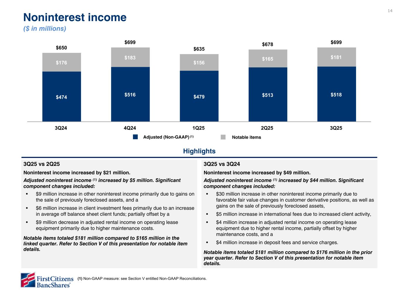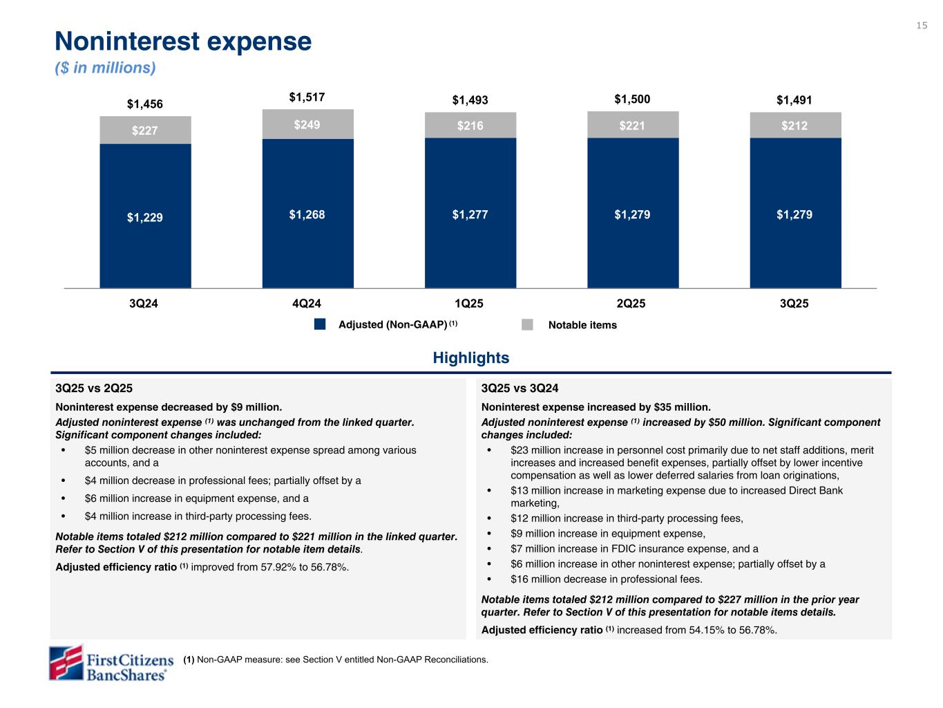 14 $650 $699 $635 $678 $699 $474 $516 $479 $513 $518 $176 $183 $156 $165 $181 3Q24 4Q24 1Q25 2Q25 3Q25 $295 $181 1Q23 SVB contribution $1,940 $2,136 $996 $1,141 $944 $995 YTD Dec 21 YTD Dec 22 3Q25 vs 2Q25 Noninterest income increased by $21 million. Adjusted noninterest income (1) increased by $5 million. Significant component changes included: • $9 million increase in other noninterest income primarily due to gains on the sale of previously foreclosed assets, and a • $6 million increase in client investment fees primarily due to an increase in average off balance sheet client funds; partially offset by a • $9 million decrease in adjusted rental income on operating lease equipment primarily due to higher maintenance costs. Notable items totaled $181 million compared to $165 million in the linked quarter. Refer to Section V of this presentation for notable item details. YTD22 vs YTD21 Noninterest income increased $196 million. Significant components of the change were: ◦ Rental income on operating leases increased $91 million due to the same reasons as in the linked quarter. Expenses on operating lease equipment declined $16 million resulting in a $107 million increase in adjusted rental income. ◦ Cardholder services income, net increased $15 million due to higher volume and fee income and other service charges increased $14 million, primarily due to higher capital markets and portfolio servicing fees. ◦ Wealth management services increased $13 million due to increased brokerage transactions and higher assets under management. ◦ Other noninterest income increased $63 million spread among various line items, including a $431 million bargain purchase gain, partially offset by a $147 million decline in investment gains and a $188 million decline in gains on asset and loan sales. Highlights Noninterest income ($ in millions) Core: ### increase 3Q25 vs 3Q24 Noninterest income increased by $49 million. Adjusted noninterest income (1) increased by $44 million. Significant component changes included: • $30 million increase in other noninterest income primarily due to favorable fair value changes in customer derivative positions, as well as gains on the sale of previously foreclosed assets, • $5 million increase in international fees due to increased client activity, • $4 million increase in adjusted rental income on operating lease equipment due to higher rental income, partially offset by higher maintenance costs, and a • $4 million increase in deposit fees and service charges. Notable items totaled $181 million compared to $176 million in the prior year quarter. Refer to Section V of this presentation for notable item details. Adjusted (Non-GAAP) (1) Notable items $176 - total notable items $181 - total notable items $518 - total adjusted (Non-GAAP) (1) (1) Non-GAAP measure: see Section V entitled Non-GAAP Reconciliations. Craig - Note that we didn’t include positive here for FV changes as the largest portion of the impact is really from the absence of negative FV changes that occurred in 1Q25. Refer to the additional file and let us know if you agree or want us to add.