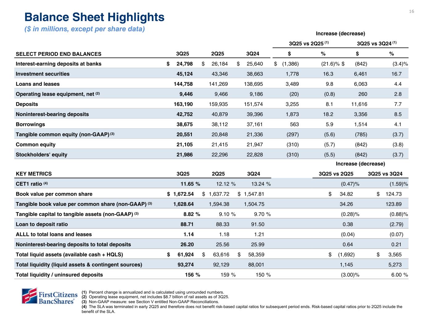 16 16 Increase (decrease) 3Q25 vs 2Q25 3Q25 vs 3Q24 SELECT PERIOD END BALANCES 3Q25 2Q25 3Q24 $ % $ % Interest-earning deposits at banks $ 24,798 $ 26,184 $ 25,640 $ (1,386) (21.6) % $ (842) (3.4) % Investment securities 45,124 43,346 38,663 1,778 16.3 6,461 16.7 Loans and leases 144,758 141,269 138,695 3,489 9.8 6,063 4.4 Operating lease equipment, net (2) 9,446 9,466 9,186 (20) (0.8) 260 2.8 Deposits 163,190 159,935 151,574 3,255 8.1 11,616 7.7 Noninterest-bearing deposits 42,752 40,879 39,396 1,873 18.2 3,356 8.5 Borrowings 38,675 38,112 37,161 563 5.9 1,514 4.1 Tangible common equity (non-GAAP) (3) 20,551 20,848 21,336 (297) (5.6) (785) (3.7) Common equity 21,105 21,415 21,947 (310) (5.7) (842) (3.8) Stockholders' equity 21,986 22,296 22,828 (310) (5.5) (842) (3.7) Increase (decrease) KEY METRICS 3Q25 2Q25 3Q24 3Q25 vs 2Q25 3Q25 vs 3Q24 CET1 ratio (4) 11.65 % 12.12 % 13.24 % (0.47) % (1.59) % Book value per common share $ 1,672.54 $ 1,637.72 $ 1,547.81 $ 34.82 $ 124.73 Tangible book value per common share (non-GAAP) (3) 1,628.64 1,594.38 1,504.75 34.26 123.89 Tangible capital to tangible assets (non-GAAP) (3) 8.82 % 9.10 % 9.70 % (0.28) % (0.88) % Loan to deposit ratio 88.71 88.33 91.50 0.38 (2.79) ALLL to total loans and leases 1.14 1.18 1.21 (0.04) (0.07) Noninterest-bearing deposits to total deposits 26.20 25.56 25.99 0.64 0.21 Total liquid assets (available cash + HQLS) $ 61,924 $ 63,616 $ 58,359 $ (1,692) $ 3,565 Total liquidity (liquid assets & contingent sources) 93,274 92,129 88,001 1,145 5,273 Total liquidity / uninsured deposits 156 % 159 % 150 % (3.00) % 6.00 % Balance Sheet Highlights ($ in millions, except per share data) (1) (1) (1) Percent change is annualized and is calculated using unrounded numbers. (2) Operating lease equipment, net includes $8.7 billion of rail assets as of 3Q25. (3) Non-GAAP measure: see Section V entitled Non-GAAP Reconciliations. (4) The SLA was terminated in early 2Q25 and therefore does not benefit risk-based capital ratios for subsequent period ends. Risk-based capital ratios prior to 2Q25 include the benefit of the SLA. CET1 ratio highlighted in yellow is directional, but not yet final.