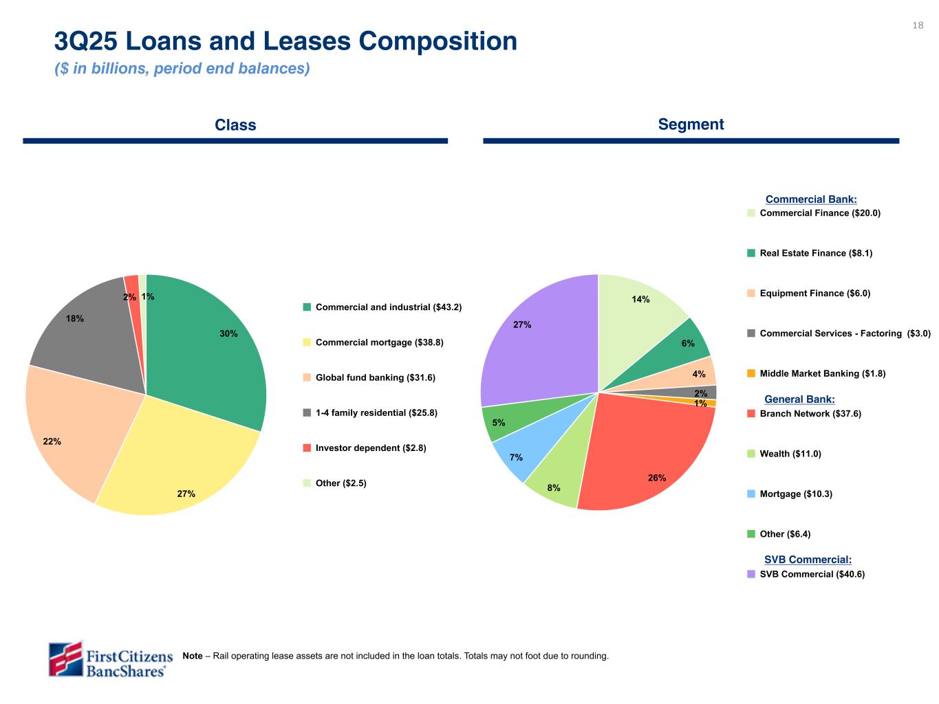 17 3Q25 vs 2Q25 • Total loans increased $3.5 billion or by 2.5% sequentially. The increase in loans was driven by a $3.1 billion increase in SVB Commercial, a $238 million increase in the General Bank and a $150 million increase in the Commercial Bank. • The increase in SVB Commercial was primarily driven by Global Fund Banking due to an increase in utilization rates and new loan commitments. 3Q25 vs 3Q24 • Total loans increased $6.1 billion or by 4.4%. The growth was primarily driven by a $3.5 billion increase in SVB Commercial, a $1.6 billion increase in the Commercial Bank and a $971 million increase in the General Bank. • SVB Commercial loan growth was driven primarily by Global Fund Banking due to the same drivers as in the linked quarter, partially offset by a decline in Tech & Healthcare Banking. • Commercial Bank loan growth was driven primarily by our industry verticals. • General Bank loan growth was primarily driven by higher business and commercial loans in the Branch Network. $138,695 $140,221 $141,358 $141,269 $144,758 $64,254 $64,887 $64,847 $64,987 $65,225 $37,343 $37,960 $38,693 $38,753 $38,904 $37,098 $37,374 $37,818 $37,529 $40,629 General Bank Commercial Bank SVB Commercial Yield on loans 3Q24 4Q24 1Q25 2Q25 3Q25 Highlights Loans and Leases ($ in millions, period end balances) 6.47%6.49% 6.69% 7.03% 6.44% 10.1% (1) (1) Commercial Bank includes a small amount of Rail loans (less than $100 million in all periods). Rail operating lease assets are not included in the loan totals. Loan data is preliminary and subject to change pending final rounding files from SEC team