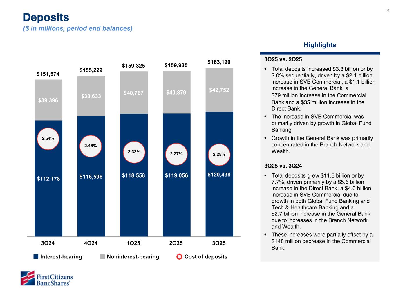 18 14% 6% 4% 2% 1% 26% 8% 7% 5% 27% Commercial Finance ($20.0) Real Estate Finance ($8.1) Equipment Finance ($6.0) Commercial Services - Factoring ($3.0) Middle Market Banking ($1.8) Branch Network ($37.6) Wealth ($11.0) Mortgage ($10.3) Other ($6.4) SVB Commercial ($40.6) 30% 27% 22% 18% 2% 1% Commercial and industrial ($43.2) Commercial mortgage ($38.8) Global fund banking ($31.6) 1-4 family residential ($25.8) Investor dependent ($2.8) Other ($2.5) Class Segment 3Q25 Loans and Leases Composition ($ in billions, period end balances) Commercial Bank: General Bank: SVB Commercial: Note – Rail operating lease assets are not included in the loan totals. Totals may not foot due to rounding.