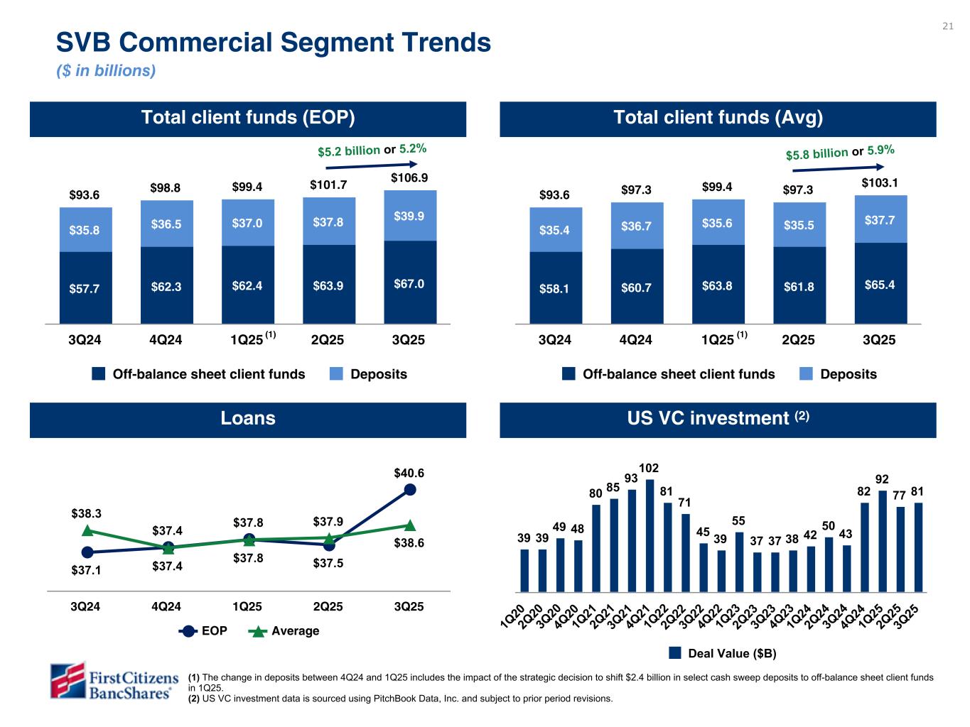 21 US VC investment (2)Loans Total client funds (Avg)Total client funds (EOP) SVB Commercial Segment Trends ($ in billions) $93.6 $98.8 $99.4 $101.7 $106.9 $57.7 $62.3 $62.4 $63.9 $67.0 $35.8 $36.5 $37.0 $37.8 $39.9 Off-balance sheet client funds Deposits 3Q24 4Q24 1Q25 2Q25 3Q25 $93.6 $97.3 $99.4 $97.3 $103.1 $58.1 $60.7 $63.8 $61.8 $65.4 $35.4 $36.7 $35.6 $35.5 $37.7 Off-balance sheet client funds Deposits 3Q24 4Q24 1Q25 2Q25 3Q25 $37.1 $37.4 $37.8 $37.5 $40.6 $38.3 $37.4 $37.8 $37.9 $38.6 EOP Average 3Q24 4Q24 1Q25 2Q25 3Q25 39 39 49 48 80 85 93 102 81 71 45 39 55 37 37 38 42 50 43 82 92 77 81 Deal Value ($B) 1Q 20 2Q 20 3Q 20 4Q 20 1Q 21 2Q 21 3Q 21 4Q 21 1Q 22 2Q 22 3Q 22 4Q 22 1Q 23 2Q 23 3Q 23 4Q 23 1Q 24 2Q 24 3Q 24 4Q 24 1Q 25 2Q 25 3Q 25 $5.2 billion or 5.2% $5.8 billion or 5.9% (1) The change in deposits between 4Q24 and 1Q25 includes the impact of the strategic decision to shift $2.4 billion in select cash sweep deposits to off-balance sheet client funds in 1Q25. (2) US VC investment data is sourced using PitchBook Data, Inc. and subject to prior period revisions. Please do not review. To be provided in subsequent draft once data is available (1) Data has been validated but still working with business to understand large differences in spot and average balance variances over linked quarter. (1) To be updated in subsequent draft once data is available. Please do not review
