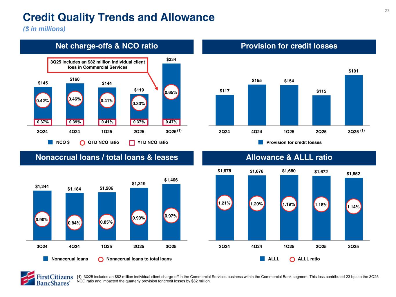 23 $117 $155 $154 $115 $191 Provision for credit losses 3Q24 4Q24 1Q25 2Q25 3Q25 Credit Quality Trends and Allowance ($ in millions) Net charge-offs & NCO ratio Provision for credit losses $145 $160 $144 $119 $234 0.42% 0.46% 0.41% 0.33% 0.65% NCO $ QTD NCO ratio YTD NCO ratio 3Q24 4Q24 1Q25 2Q25 3Q25 $1,244 $1,184 $1,206 $1,319 0.90% 0.84% 0.85% 0.93% 0.97% Nonaccrual loans Nonaccrual loans to total loans 3Q24 4Q24 1Q25 2Q25 3Q25 Nonaccrual loans / total loans & leases Allowance & ALLL ratio $1,678 $1,676 $1,680 $1,672 $1,652 1.21% 1.20% 1.19% 1.18% 1.14% ALLL ALLL ratio 3Q24 4Q24 1Q25 2Q25 3Q25 0.47%0.37% 0.39% 0.41% 0.37% To be updated in subsequent draft Nonaccrual loan balance and % to total loans numbers are preliminary and will be finalized in subsequent draft. $1,244 $1,184 $1,206 $1,319 $1,406 0.90% 0.84% 0.85% 0.93% 0.97% Nonaccrual loans Nonaccrual loans to total loans 3Q24 4Q24 1Q25 2Q25 3Q25 $234 $152 $82 Non-FB FB Non-FB Ratio FB Ratio 3Q24 4Q24 1Q25 2Q25 3Q25 (1) 3Q25 includes an $82 million individual client charge-off in the Commercial Services business within the Commercial Bank segment. This loss contributed 23 bps to the 3Q25 NCO ratio and impacted the quarterly provision for credit losses by $82 million. (1) 3Q25 includes an $82 million individual client loss in Commercial Services (1) Craig - We have not specifically called out ‘First Brands’ on the slide but do plan to note the company in the script (similar with JPM’s approach to discuss ‘tricolor’ during Q&A but to leave off the IP). Additionally, in the ER we are calling this business ‘supply chain finance’. We have opted to call this ‘Commercial Services’, which is aligned with how we have historically discussed this business in the IP and script. Jim Mortimer in legal is aligned with this approach as well.