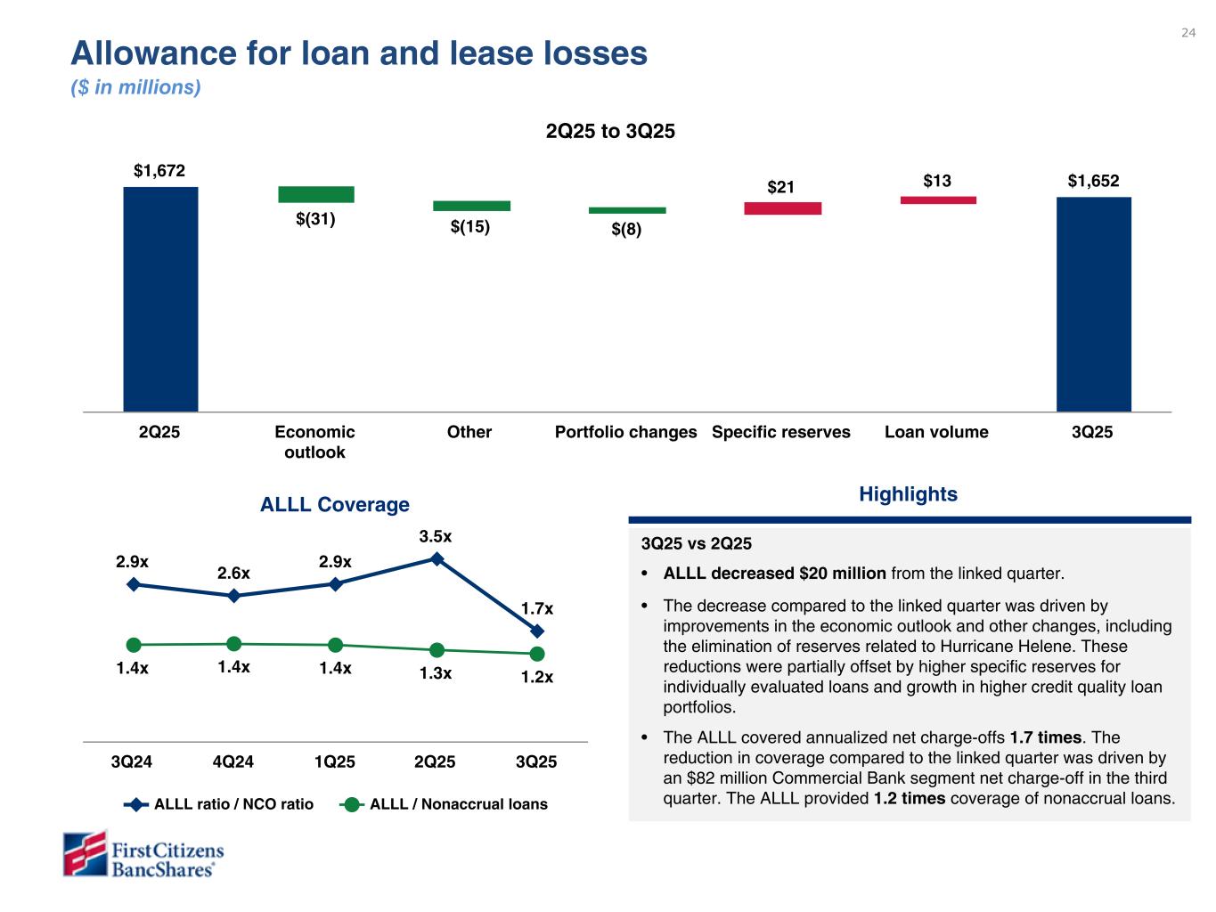 24 $1,672 $(31) $(15) $(8) $21 $13 $1,652 2Q25 Economic outlook Other Portfolio changes Specific reserves Loan volume 3Q25 Highlights 3Q25 vs 2Q25 • ALLL decreased $20 million from the linked quarter. • The decrease compared to the linked quarter was driven by improvements in the economic outlook and other changes, including the elimination of reserves related to Hurricane Helene. These reductions were partially offset by higher specific reserves for individually evaluated loans and growth in higher credit quality loan portfolios. • The ALLL covered annualized net charge-offs 1.7 times. The reduction in coverage compared to the linked quarter was driven by an $82 million Commercial Bank segment net charge-off in the third quarter. The ALLL provided 1.2 times coverage of nonaccrual loans. ALLL Coverage 2.9x 2.6x 2.9x 3.5x 1.7x 1.4x 1.4x 1.4x 1.3x 1.2x ALLL ratio / NCO ratio ALLL / Nonaccrual loans 3Q24 4Q24 1Q25 2Q25 3Q25 2Q25 to 3Q25 Allowance for loan and lease losses ($ in millions) Please do not review - data still being finalized. To be provided in subsequent draft. Highlights commentary with Robert for review To be updated in subsequent draft once data is available. Please do not review