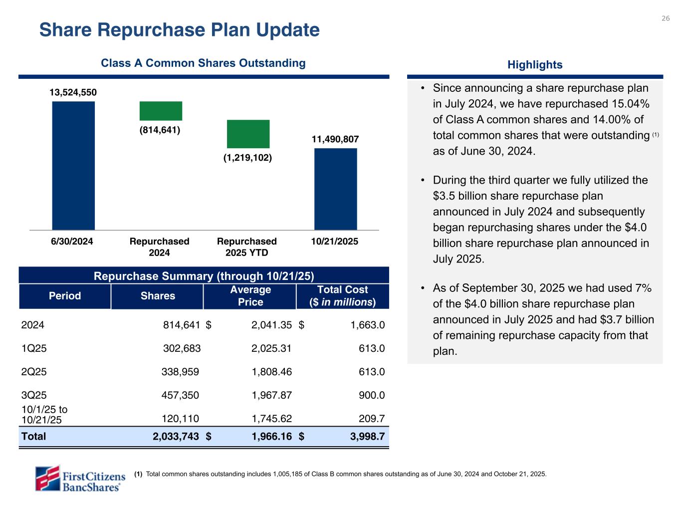 25 Reported capital ratios (1) Capital ratio rollforward Adjusted risk-based capital ratios (1) Tangible book value per share (2) Capital Risk-Based Capital (1) Tier 1 Leverage Total Tier 1 CET1 December 31, 2024 15.04 % 13.53 % 12.99 % 9.90 % June 30, 2025 14.25 % 12.63 % 12.12 % 9.62 % Sub-debt issuance 0.34 % 0.00 % 0.00 % 0.00 % Net income 0.33 % 0.33 % 0.33 % 0.25 % Change in risk-weighted/average assets -0.31 % -0.27 % -0.26 % -0.12 % Share repurchases -0.52 % -0.52 % -0.52 % -0.40 % Common dividends -0.01 % -0.01 % -0.01 % -0.01 % Preferred dividends -0.01 % -0.01 % -0.01 % -0.01 % Other -0.02 % 0.00 % 0.00 % 0.01 % September 30, 2025 14.05 % 12.15 % 11.65 % 9.34 % Change since June 30, 2025 -0.20 % -0.48 % -0.47 % -0.28 % 13.24% 12.99% 12.81% 12.12% 11.65% 13.78% 13.53% 13.35% 12.63% 12.15% 15.36% 15.04% 15.23% 14.25% 14.05% 3Q24 4Q24 1Q25 2Q25 3Q25 $1,512.77 $128.49 $31.76 ($38.53) ($5.85) $1,628.64 4Q24 Retained earnings AOCI Share repurchases Common dividends 3Q25 Note – The above capital ratios represent BancShares ratios and are preliminary pending completion of quarterly regulatory filings. (1) The SLA was terminated in early 2Q25 and therefore does not benefit risk-based capital ratios for subsequent period ends. Reported risk-based capital ratios prior to 2Q25 include the benefit of the SLA while the adjusted capital ratios prior to 2Q25 exclude the SLA benefit. (2) Non-GAAP measure: see Section V entitled Non-GAAP Reconciliations. 10.17% 9.90% 9.75% 9.62% 9.34% Tier 1 Lev 12.51% 12.33% 12.19% 12.12% 11.65% 13.02% 12.84% 12.70% 12.63% 12.15% 14.51% 14.27% 14.49% 14.25% 14.05% CET1 Tier 1 Total 3Q24 4Q24 1Q25 2Q25 3Q25 Please do not review - data still being finalized. To be provided in subsequent draft. CET1 (1) Tier 1 Total To be updated in subsequent draft once data is available. Please do not review