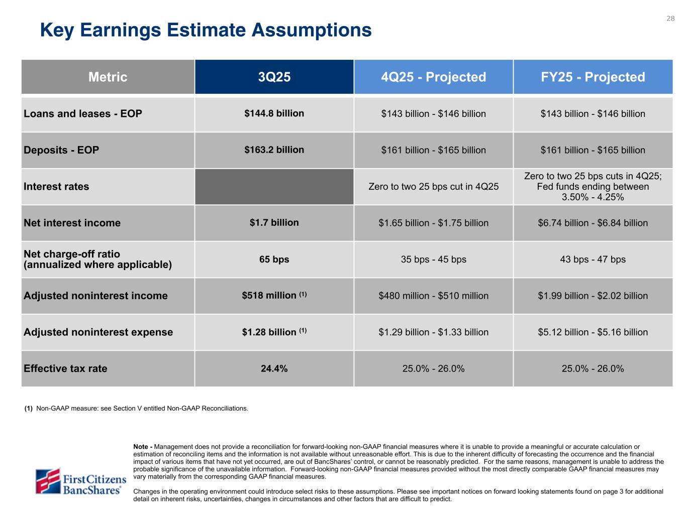 28 Metric 3Q25 4Q25 - Projected FY25 - Projected Loans and leases - EOP $144.8 billion $143 billion - $146 billion $143 billion - $146 billion Deposits - EOP $163.2 billion $161 billion - $165 billion $161 billion - $165 billion Interest rates Zero to two 25 bps cut in 4Q25 Zero to two 25 bps cuts in 4Q25; Fed funds ending between 3.50% - 4.25% Net interest income $1.7 billion $1.65 billion - $1.75 billion $6.74 billion - $6.84 billion Net charge-off ratio (annualized where applicable) 65 bps 35 bps - 45 bps 43 bps - 47 bps Adjusted noninterest income $518 million (1) $480 million - $510 million $1.99 billion - $2.02 billion Adjusted noninterest expense $1.28 billion (1) $1.29 billion - $1.33 billion $5.12 billion - $5.16 billion Effective tax rate 24.4% 25.0% - 26.0% 25.0% - 26.0% Key Earnings Estimate Assumptions (1) Non-GAAP measure: see Section V entitled Non-GAAP Reconciliations. Note - Management does not provide a reconciliation for forward-looking non-GAAP financial measures where it is unable to provide a meaningful or accurate calculation or estimation of reconciling items and the information is not available without unreasonable effort. This is due to the inherent difficulty of forecasting the occurrence and the financial impact of various items that have not yet occurred, are out of BancShares’ control, or cannot be reasonably predicted. For the same reasons, management is unable to address the probable significance of the unavailable information. Forward-looking non-GAAP financial measures provided without the most directly comparable GAAP financial measures may vary materially from the corresponding GAAP financial measures. Changes in the operating environment could introduce select risks to these assumptions. Please see important notices on forward looking statements found on page 3 for additional detail on inherent risks, uncertainties, changes in circumstances and other factors that are difficult to predict. To be updated in subsequent draft once data is available. Please do not review