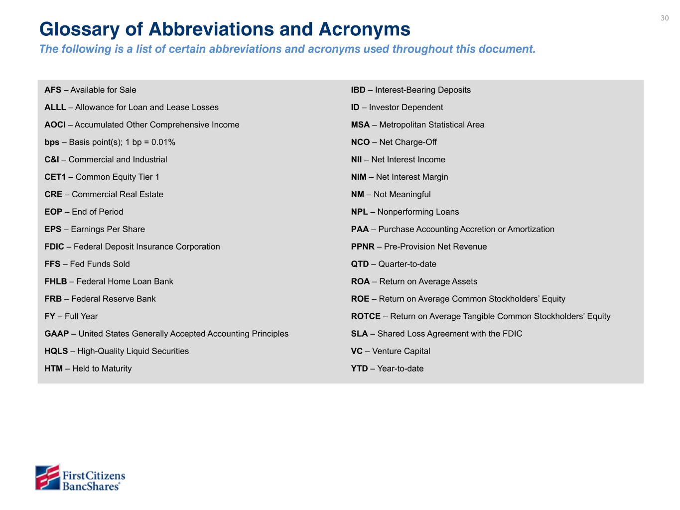 30 Glossary of Abbreviations and Acronyms The following is a list of certain abbreviations and acronyms used throughout this document. AFS – Available for Sale ALLL – Allowance for Loan and Lease Losses AOCI – Accumulated Other Comprehensive Income bps – Basis point(s); 1 bp = 0.01% C&I – Commercial and Industrial CET1 – Common Equity Tier 1 CRE – Commercial Real Estate EOP – End of Period EPS – Earnings Per Share FDIC – Federal Deposit Insurance Corporation FFS – Fed Funds Sold FHLB – Federal Home Loan Bank FRB – Federal Reserve Bank FY – Full Year GAAP – United States Generally Accepted Accounting Principles HQLS – High-Quality Liquid Securities HTM – Held to Maturity IBD – Interest-Bearing Deposits ID – Investor Dependent MSA – Metropolitan Statistical Area NCO – Net Charge-Off NII – Net Interest Income NIM – Net Interest Margin NM – Not Meaningful NPL – Nonperforming Loans PAA – Purchase Accounting Accretion or Amortization PPNR – Pre-Provision Net Revenue QTD – Quarter-to-date ROA – Return on Average Assets ROE – Return on Average Common Stockholders’ Equity ROTCE – Return on Average Tangible Common Stockholders’ Equity SLA – Shared Loss Agreement with the FDIC VC – Venture Capital YTD – Year-to-date 3Q25 Additions 3Q25 Removals Archive ACL – Allowance for Credit Losses CAB - Community Association Banking NIB - Noninterest-bearing RBC - Risk-Based Capital TA - Tangible Assets TCE - Tangible Common Equity AUM – Assets Under Management AWA – Affluent Wealth Advisors LIBOR – London Inter-Bank Offered Rate LOC – Line of Credit MSA – Metropolitan Statistical Area PE – Private Equity RIA – Registered Investment Advisor SOFR – Secured Overnight Financing Rate LTD – Long Term Debt RWA – Risk Weighted Assets ACH – Automated clearing house CECL – Current Expected Credit Losses ETF – Exchange-Traded Fund FFR – Federal Funds Rate IPO – Initial Public Offering LP – Limited Partner VC – Venture Capital AI – Artificial Intelligence FFR – Federal Funds Rate FY – Full Year GFB – Global Fund Banking OBS – Off Balance Sheet Client Funds PCD – Purchased Credit Deteriorated LFI – Large Financial Institution TBV – Tangible Book Value FX – Foreign Exchange Under review - to be provided in subsequent draft Not on main pages and/or do not come up in search AOCI QTD