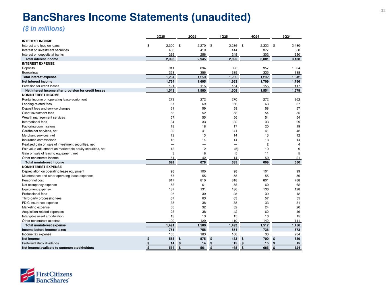 32 3Q25 2Q25 1Q25 4Q24 3Q24 INTEREST INCOME Interest and fees on loans $ 2,300 $ 2,270 $ 2,236 $ 2,322 $ 2,430 Interest on investment securities 433 419 414 377 358 Interest on deposits at banks 265 256 245 302 350 Total interest income 2,998 2,945 2,895 3,001 3,138 INTEREST EXPENSE Deposits 911 894 893 957 1,004 Borrowings 353 356 339 335 338 Total interest expense 1,264 1,250 1,232 1,292 1,342 Net interest income 1,734 1,695 1,663 1,709 1,796 Provision for credit losses 191 115 154 155 117 Net interest income after provision for credit losses 1,543 1,580 1,509 1,554 1,679 NONINTEREST INCOME Rental income on operating lease equipment 273 272 270 272 262 Lending-related fees 67 69 66 68 67 Deposit fees and service charges 61 59 58 58 57 Client investment fees 58 52 53 54 55 Wealth management services 57 55 56 54 54 International fees 34 33 32 33 29 Factoring commissions 18 18 17 20 19 Cardholder services, net 39 41 41 41 42 Merchant services, net 12 13 14 13 12 Insurance commissions 13 14 14 13 14 Realized gain on sale of investment securities, net — — — 2 4 Fair value adjustment on marketable equity securities, net 13 2 (5) 10 9 Gain on sale of leasing equipment, net 3 8 5 11 5 Other noninterest income 51 42 14 50 21 Total noninterest income 699 678 635 699 650 NONINTEREST EXPENSE Depreciation on operating lease equipment 98 100 98 101 99 Maintenance and other operating lease expenses 67 55 58 55 59 Personnel cost 817 810 818 801 788 Net occupancy expense 58 61 58 60 62 Equipment expense 137 131 136 136 128 Professional fees 26 30 25 30 42 Third-party processing fees 67 63 63 57 55 FDIC insurance expense 38 38 38 33 31 Marketing expense 33 32 32 24 20 Acquisition-related expenses 28 38 42 62 46 Intangible asset amortization 13 13 15 16 15 Other noninterest expense 109 129 110 142 111 Total noninterest expense 1,491 1,500 1,493 1,517 1,456 Income before income taxes 751 758 651 736 873 Income tax expense 183 183 168 36 234 Net income $ 568 $ 575 $ 483 $ 700 $ 639 Preferred stock dividends $ 14 $ 14 $ 15 $ 15 $ 15 Net income available to common stockholders $ 554 $ 561 $ 468 $ 685 $ 624 BancShares Income Statements (unaudited) ($ in millions)