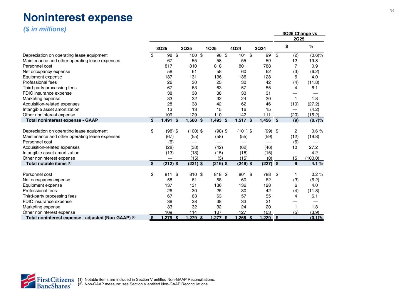 33 Noninterest income ($ in millions) 3Q25 Change vs 2Q25 3Q25 2Q25 1Q25 4Q24 3Q24 $ % Rental income on operating lease equipment $ 273 $ 272 $ 270 $ 272 $ 262 $ 1 0.4 % Lending-related fees 67 69 66 68 67 (2) (2.7) Deposit fees and service charges 61 59 58 58 57 2 3.2 Client investment fees 58 52 53 54 55 6 13.0 Wealth management services 57 55 56 54 54 2 2.9 International fees 34 33 32 33 29 1 4.3 Factoring commissions 18 18 17 20 19 — 0.1 Cardholder services, net 39 41 41 41 42 (2) (5.5) Merchant services, net 12 13 14 13 12 (1) (6.3) Insurance commissions 13 14 14 13 14 (1) (9.3) Realized gain on sale of investment securities, net — — — 2 4 — — Fair value adjustment on marketable equity securities, net 13 2 (5) 10 9 11 470.4 Gain on sale of leasing equipment, net 3 8 5 11 5 (5) (64.9) Other noninterest income 51 42 14 50 21 9 20.4 Total noninterest income - GAAP $ 699 $ 678 $ 635 $ 699 $ 650 $ 21 3.1 % Depreciation and maintenance expense on operating lease equipment (1) $ (165) $ (155) $ (156) $ (152) $ (158) $ (10) (6.5) % Realized gain on sale of investment securities, net — — — (2) (4) — — Fair value adjustment on marketable equity securities, net (13) (2) 5 (10) (9) (11) (470.4) Gain on sale of leasing equipment, net (3) (8) (5) (11) (5) 5 64.9 Other noninterest income — — — (8) — — — Total notable items (2) $ (181) $ (165) $ (156) $ (183) $ (176) $ (16) (9.7) % Adjusted rental income on operating lease equipment (1) $ 108 $ 117 $ 114 $ 120 $ 104 $ (9) (8.0) % Lending-related fees 67 69 66 68 67 (2) (2.7) Deposit fees and service charges 61 59 58 58 57 2 3.2 Client investment fees 58 52 53 54 55 6 13.0 Wealth management services 57 55 56 54 54 2 2.9 International fees 34 33 32 33 29 1 4.3 Factoring commissions 18 18 17 20 19 — 0.1 Cardholder services, net 39 41 41 41 42 (2) (5.5) Merchant services, net 12 13 14 13 12 (1) (6.3) Insurance commissions 13 14 14 13 14 (1) (9.3) Other noninterest income 51 42 14 42 21 9 20.4 Total noninterest income - adjusted (Non-GAAP) (3) $ 518 $ 513 $ 479 $ 516 $ 474 $ 5 0.9 % (1) Depreciation on operating lease equipment includes impairment of $4 million on rail assets in 4Q24. The $4 million impairment is a notable item and is excluded from adjusted rental income on operating lease equipment. See Section V entitled Non-GAAP Reconciliations. (2) Notable items are included in Section V entitled Non-GAAP Reconciliations. (3) Non-GAAP measure: see Section V entitled Non-GAAP Reconciliations.