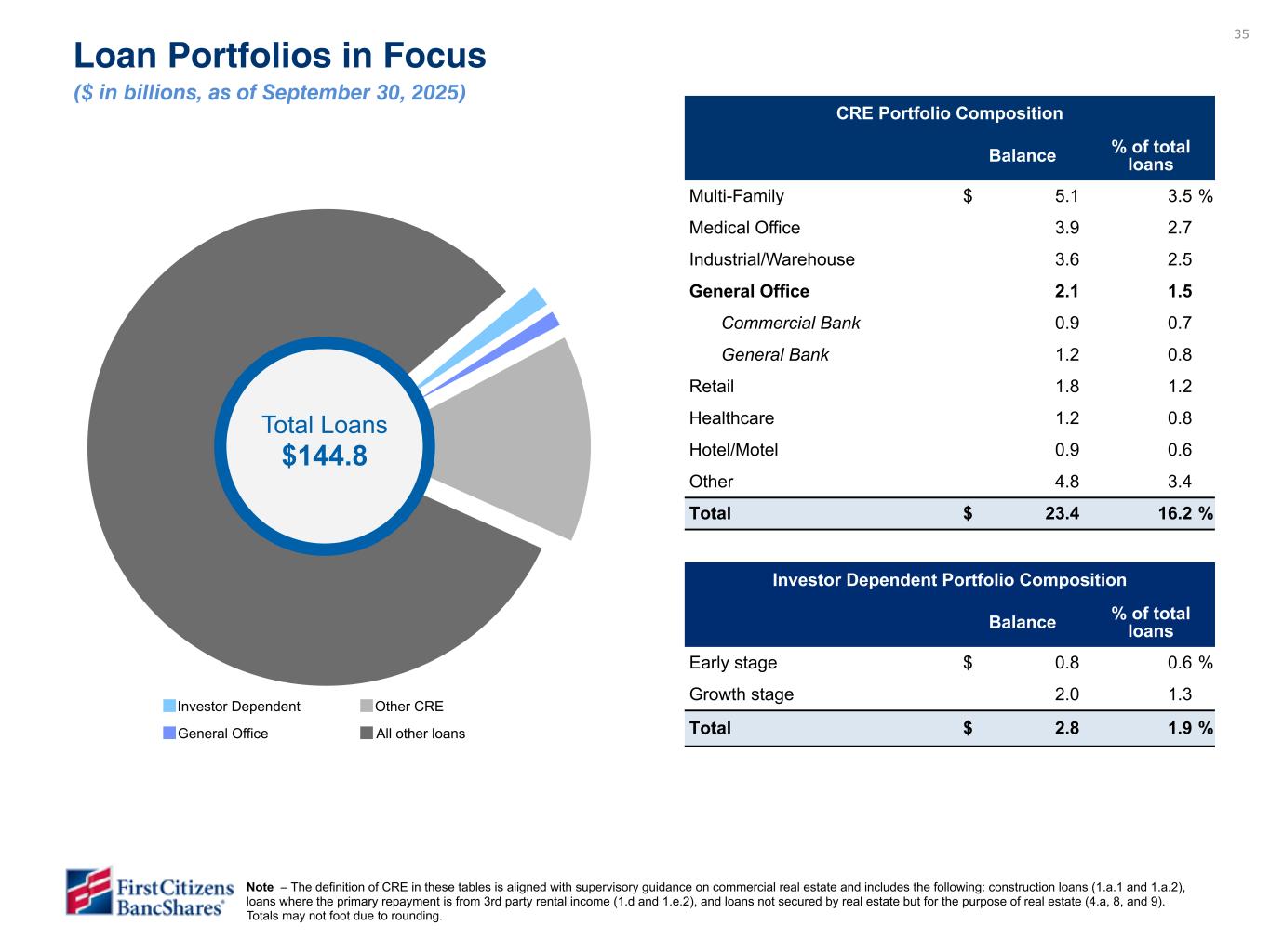 34 3Q25 Change vs 2Q25 3Q25 2Q25 1Q25 4Q24 3Q24 $ % Depreciation on operating lease equipment $ 98 $ 100 $ 98 $ 101 $ 99 $ (2) (0.6) % Maintenance and other operating lease expenses 67 55 58 55 59 12 19.8 Personnel cost 817 810 818 801 788 7 0.9 Net occupancy expense 58 61 58 60 62 (3) (6.2) Equipment expense 137 131 136 136 128 6 4.0 Professional fees 26 30 25 30 42 (4) (11.8) Third-party processing fees 67 63 63 57 55 4 6.1 FDIC insurance expense 38 38 38 33 31 — — Marketing expense 33 32 32 24 20 1 1.8 Acquisition-related expenses 28 38 42 62 46 (10) (27.2) Intangible asset amortization 13 13 15 16 15 — (4.2) Other noninterest expense 109 129 110 142 111 (20) (15.2) Total noninterest expense - GAAP $ 1,491 $ 1,500 $ 1,493 $ 1,517 $ 1,456 $ (9) (0.7) % Depreciation on operating lease equipment $ (98) $ (100) $ (98) $ (101) $ (99) $ 2 0.6 % Maintenance and other operating lease expenses (67) (55) (58) (55) (59) (12) (19.8) Personnel cost (6) — — — — (6) — Acquisition-related expenses (28) (38) (42) (62) (46) 10 27.2 Intangible asset amortization (13) (13) (15) (16) (15) — 4.2 Other noninterest expense — (15) (3) (15) (8) 15 (100.0) Total notable items (1) $ (212) $ (221) $ (216) $ (249) $ (227) $ 9 4.1 % Personnel cost $ 811 $ 810 $ 818 $ 801 $ 788 $ 1 0.2 % Net occupancy expense 58 61 58 60 62 (3) (6.2) Equipment expense 137 131 136 136 128 6 4.0 Professional fees 26 30 25 30 42 (4) (11.8) Third-party processing fees 67 63 63 57 55 4 6.1 FDIC insurance expense 38 38 38 33 31 — — Marketing expense 33 32 32 24 20 1 1.8 Other noninterest expense 109 114 107 127 103 (5) (3.9) Total noninterest expense - adjusted (Non-GAAP) (2) $ 1,279 $ 1,279 $ 1,277 $ 1,268 $ 1,229 $ — (0.1) % Noninterest expense ($ in millions) (1) Notable items are included in Section V entitled Non-GAAP Reconciliations. (2) Non-GAAP measure: see Section V entitled Non-GAAP Reconciliations.