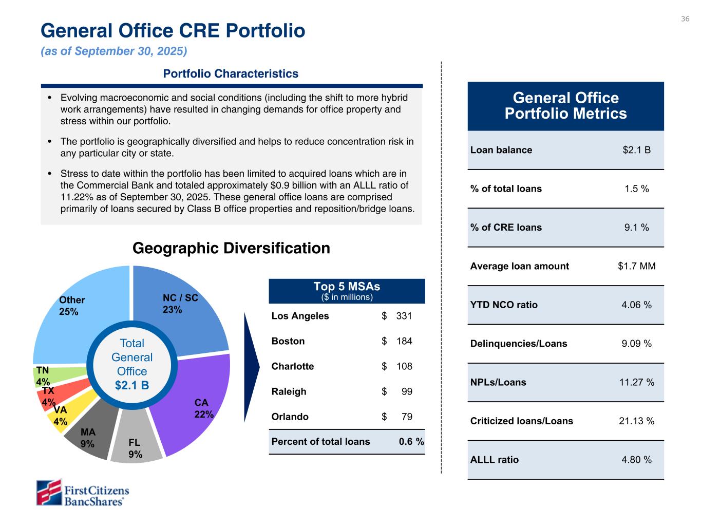 35 Loan Portfolios in Focus ($ in billions, as of September 30, 2025) Total Loans $144.8 CRE $23.4 CRE Portfolio Composition Balance % of total loans Multi-Family $ 5.1 3.5 % Medical Office 3.9 2.7 Industrial/Warehouse 3.6 2.5 General Office 2.1 1.5 Commercial Bank 0.9 0.7 General Bank 1.2 0.8 Retail 1.8 1.2 Healthcare 1.2 0.8 Hotel/Motel 0.9 0.6 Other 4.8 3.4 Total $ 23.4 16.2 % Investor Dependent Portfolio Composition Balance % of total loans Early stage $ 0.8 0.6 % Growth stage 2.0 1.3 Total $ 2.8 1.9 % Investor dependent $2.8 Note – The definition of CRE in these tables is aligned with supervisory guidance on commercial real estate and includes the following: construction loans (1.a.1 and 1.a.2), loans where the primary repayment is from 3rd party rental income (1.d and 1.e.2), and loans not secured by real estate but for the purpose of real estate (4.a, 8, and 9). Totals may not foot due to rounding. Bottom table shifted given change in SEC classes this quarter and still working through formatting on this slide. Investor Dependent Other CRE All other loansGeneral Office General office balances are directional, but not yet final.