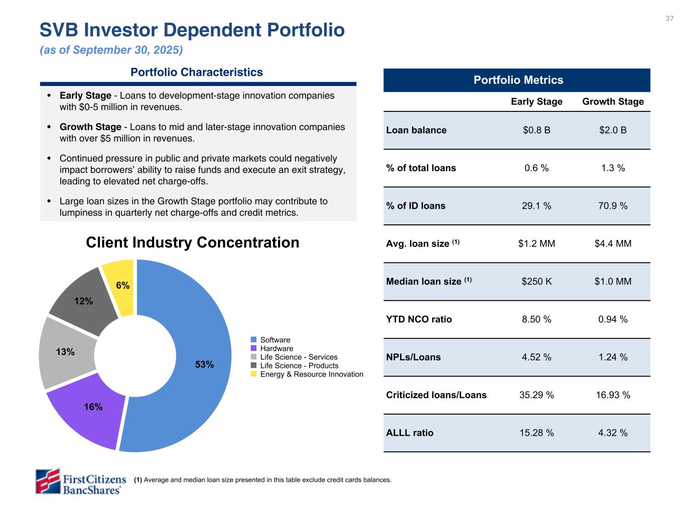 36 General Office CRE Portfolio (as of September 30, 2025) NC / SC 23% CA 22% FL 9% MA 9% VA 4% TX 4% TN 4% Other 25% Total General Office $2.1 B Geographic Diversification Top 5 MSAs ($ in millions) Los Angeles $ 331 Boston $ 184 Charlotte $ 108 Raleigh $ 99 Orlando $ 79 Percent of total loans 0.6 % General Office Portfolio Metrics Loan balance $2.1 B % of total loans 1.5 % % of CRE loans 9.1 % Average loan amount $1.7 MM YTD NCO ratio 4.06 % Delinquencies/Loans 9.09 % NPLs/Loans 11.27 % Criticized loans/Loans 21.13 % ALLL ratio 4.80 % Portfolio Characteristics • Evolving macroeconomic and social conditions (including the shift to more hybrid work arrangements) have resulted in changing demands for office property and stress within our portfolio. • The portfolio is geographically diversified and helps to reduce concentration risk in any particular city or state. • Stress to date within the portfolio has been limited to acquired loans which are in the Commercial Bank and totaled approximately $0.9 billion with an ALLL ratio of 11.22% as of September 30, 2025. These general office loans are comprised primarily of loans secured by Class B office properties and reposition/bridge loans. Data is directional but under further review.