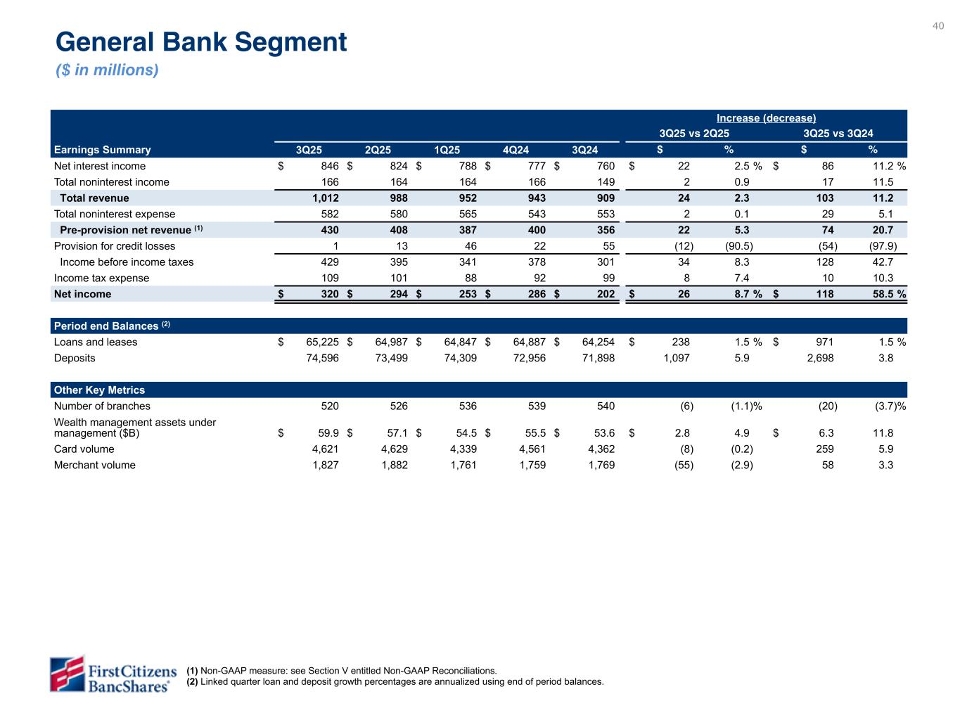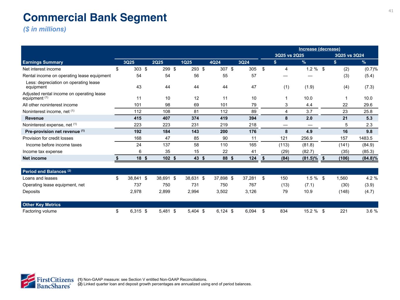 40 General Bank Segment ($ in millions) (1) Non-GAAP measure: see Section V entitled Non-GAAP Reconciliations. (2) Linked quarter loan and deposit growth percentages are annualized using end of period balances. Increase (decrease) 3Q25 vs 2Q25 3Q25 vs 3Q24 Earnings Summary 3Q25 2Q25 1Q25 4Q24 3Q24 $ % $ % Net interest income $ 846 $ 824 $ 788 $ 777 $ 760 $ 22 2.5 % $ 86 11.2 % Total noninterest income 166 164 164 166 149 2 0.9 17 11.5 Total revenue 1,012 988 952 943 909 24 2.3 103 11.2 Total noninterest expense 582 580 565 543 553 2 0.1 29 5.1 Pre-provision net revenue (1) 430 408 387 400 356 22 5.3 74 20.7 Provision for credit losses 1 13 46 22 55 (12) (90.5) (54) (97.9) Income before income taxes 429 395 341 378 301 34 8.3 128 42.7 Income tax expense 109 101 88 92 99 8 7.4 10 10.3 Net income $ 320 $ 294 $ 253 $ 286 $ 202 $ 26 8.7 % $ 118 58.5 % Period end Balances (2) Loans and leases $ 65,225 $ 64,987 $ 64,847 $ 64,887 $ 64,254 $ 238 1.5 % $ 971 1.5 % Deposits 74,596 73,499 74,309 72,956 71,898 1,097 5.9 2,698 3.8 Other Key Metrics Number of branches 520 526 536 539 540 (6) (1.1) % (20) (3.7) % Wealth management assets under management ($B) $ 59.9 $ 57.1 $ 54.5 $ 55.5 $ 53.6 $ 2.8 4.9 $ 6.3 11.8 Card volume 4,621 4,629 4,339 4,561 4,362 (8) (0.2) 259 5.9 Merchant volume 1,827 1,882 1,761 1,759 1,769 (55) (2.9) 58 3.3 Highlights • The General Bank segment achieved strong loan growth during the quarter, 4.1% annualized over the linked quarter, driven primarily by business and commercial loan production in the Branch Network. • Deposits increased $893 million compared to the linked quarter driven by growth in the Branch Network. • Segment net revenue increased $32 million compared to the linked quarter as net interest income increased $15 million and noninterest income increased by $17 million. Noninterest expense decreased by $20 million compared to the linked quarter. Data has not yet been validated but is directional. To be finalized in subsequent draft.