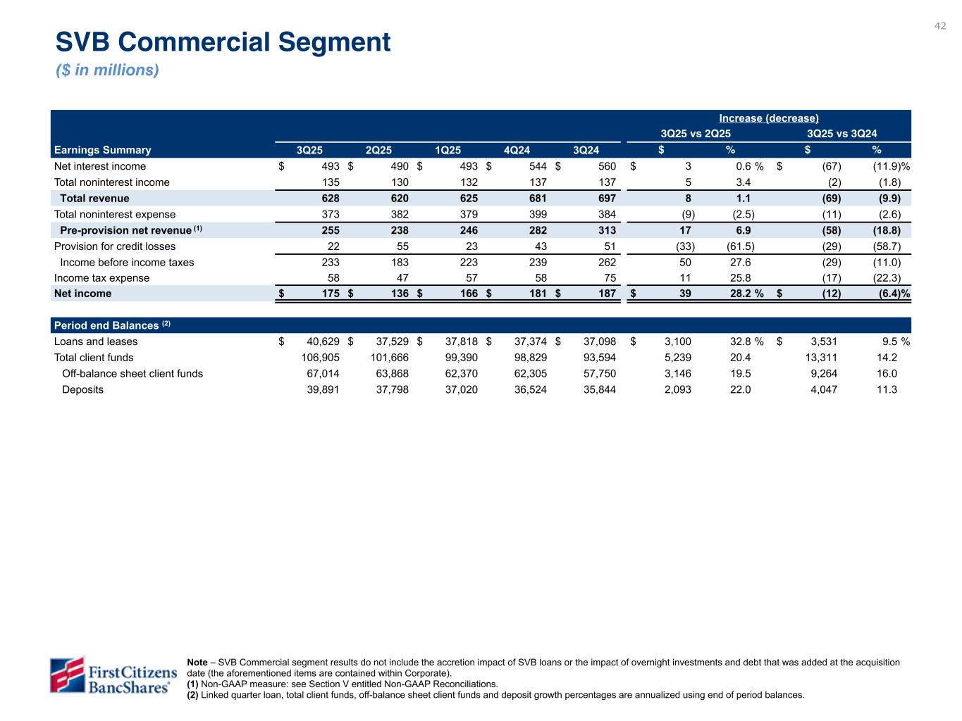 41 Increase (decrease) 3Q25 vs 2Q25 3Q25 vs 3Q24 Earnings Summary 3Q25 2Q25 1Q25 4Q24 3Q24 $ % $ % Net interest income $ 303 $ 299 $ 293 $ 307 $ 305 $ 4 1.2 % $ (2) (0.7) % Rental income on operating lease equipment 54 54 56 55 57 — — (3) (5.4) Less: depreciation on operating lease equipment 43 44 44 44 47 (1) (1.9) (4) (7.3) Adjusted rental income on operating lease equipment (1) 11 10 12 11 10 1 10.0 1 10.0 All other noninterest income 101 98 69 101 79 3 4.4 22 29.6 Noninterest income, net (1) 112 108 81 112 89 4 3.7 23 25.8 Revenue 415 407 374 419 394 8 2.0 21 5.3 Noninterest expense, net (1) 223 223 231 219 218 — — 5 2.3 Pre-provision net revenue (1) 192 184 143 200 176 8 4.9 16 9.8 Provision for credit losses 168 47 85 90 11 121 256.9 157 1483.5 Income before income taxes 24 137 58 110 165 (113) (81.8) (141) (84.9) Income tax expense 6 35 15 22 41 (29) (82.7) (35) (85.3) Net income $ 18 $ 102 $ 43 $ 88 $ 124 $ (84) (81.5) % $ (106) (84.8) % Period end Balances (2) Loans and leases $ 38,841 $ 38,691 $ 38,631 $ 37,898 $ 37,281 $ 150 1.5 % $ 1,560 4.2 % Operating lease equipment, net 737 750 731 750 767 (13) (7.1) (30) (3.9) Deposits 2,978 2,899 2,994 3,502 3,126 79 10.9 (148) (4.7) Other Key Metrics Factoring volume $ 6,315 $ 5,481 $ 5,404 $ 6,124 $ 6,094 $ 834 15.2 % $ 221 3.6 % Highlights • The Commercial Bank segment achieved strong loan growth during the quarter, 6.2% annualized over the linked quarter, largely driven by strong origination volume in our industry verticals. • Factoring volume totaled $6.3 billion, relatively in line with the linked quarter and the prior year quarter. • Segment revenue increased $15 million compared to the linked quarter, primarily driven by higher noninterest income. Commercial Bank Segment ($ in millions) (1) Non-GAAP measure: see Section V entitled Non-GAAP Reconciliations. (2) Linked quarter loan and deposit growth percentages are annualized using end of period balances. Data has not yet been validated but is directional. To be finalized in subsequent draft.