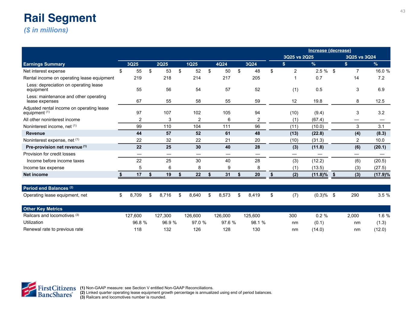 43 Increase (decrease) 3Q25 vs 2Q25 3Q25 vs 3Q24 Earnings Summary 3Q25 2Q25 1Q25 4Q24 3Q24 $ % $ % Net interest expense $ 55 $ 53 $ 52 $ 50 $ 48 $ 2 2.5 % $ 7 16.0 % Rental income on operating lease equipment 219 218 214 217 205 1 0.7 14 7.2 Less: depreciation on operating lease equipment 55 56 54 57 52 (1) 0.5 3 6.9 Less: maintenance and other operating lease expenses 67 55 58 55 59 12 19.8 8 12.5 Adjusted rental income on operating lease equipment (1) 97 107 102 105 94 (10) (9.4) 3 3.2 All other noninterest income 2 3 2 6 2 (1) (67.4) — — Noninterest income, net (1) 99 110 104 111 96 (11) (10.0) 3 3.1 Revenue 44 57 52 61 48 (13) (22.8) (4) (8.3) Noninterest expense, net (1) 22 32 22 21 20 (10) (31.3) 2 10.0 Pre-provision net revenue (1) 22 25 30 40 28 (3) (11.8) (6) (20.1) Provision for credit losses — — — — — — — — — Income before income taxes 22 25 30 40 28 (3) (12.2) (6) (20.5) Income tax expense 5 6 8 9 8 (1) (13.5) (3) (27.5) Net income $ 17 $ 19 $ 22 $ 31 $ 20 $ (2) (11.8) % $ (3) (17.9) % Period end Balances (2) Operating lease equipment, net $ 8,709 $ 8,716 $ 8,640 $ 8,573 $ 8,419 $ (7) (0.3) % $ 290 3.5 % Other Key Metrics Railcars and locomotives (3) 127,600 127,300 126,600 126,000 125,600 300 0.2 % 2,000 1.6 % Utilization 96.8 % 96.9 % 97.0 % 97.6 % 98.1 % nm (0.1) nm (1.3) Renewal rate to previous rate 118 132 126 128 130 nm (14.0) nm (12.0) Rail Segment ($ in millions) (1) Non-GAAP measure: see Section V entitled Non-GAAP Reconciliations. (2) Linked quarter operating lease equipment growth percentage is annualized using end of period balances. (3) Railcars and locomotives number is rounded. Highlights • The fleet is effectively fully utilized, with a utilization rate of 96.8%. • Favorable renewal repricing trends continued, up 28% over the expiring rate for the quarter, with gains in both freight cars (+36%) and tank cars (+21%). • Adjusted rental income on operating lease equipment increased from the linked quarter reflecting fleet growth, continued positive repricing trends and lower maintenance expense. Data has not yet been validated but is directional. To be finalized in subsequent draft.