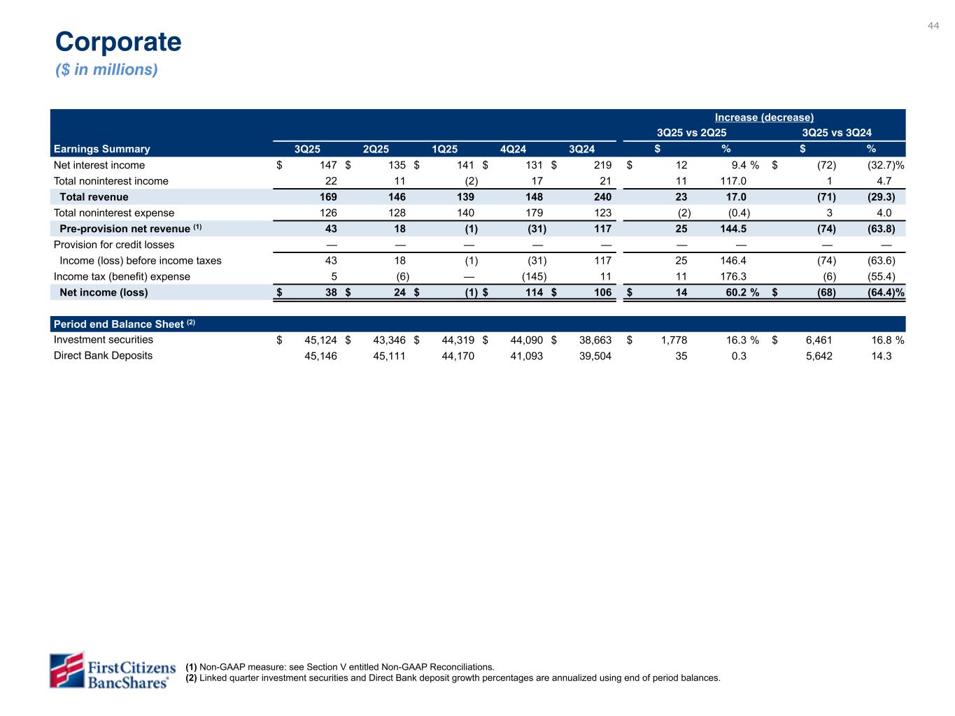 44 Highlights • Net interest income decreased compared to the linked quarter driven primarily by lower interest income from overnight investments and higher interest expense from growth in Direct Bank deposits, partially offset by increased interest income from higher investment securities. • Noninterest expense increased driven primarily by similar items as noted on slide 16. • Direct Bank deposits reflect continued growth in the channel even with declining rates paid. Corporate ($ in millions) (1) Non-GAAP measure: see Section V entitled Non-GAAP Reconciliations. (2) Linked quarter investment securities and Direct Bank deposit growth percentages are annualized using end of period balances. Increase (decrease) 3Q25 vs 2Q25 3Q25 vs 3Q24 Earnings Summary 3Q25 2Q25 1Q25 4Q24 3Q24 $ % $ % Net interest income $ 147 $ 135 $ 141 $ 131 $ 219 $ 12 9.4 % $ (72) (32.7) % Total noninterest income 22 11 (2) 17 21 11 117.0 1 4.7 Total revenue 169 146 139 148 240 23 17.0 (71) (29.3) Total noninterest expense 126 128 140 179 123 (2) (0.4) 3 4.0 Pre-provision net revenue (1) 43 18 (1) (31) 117 25 144.5 (74) (63.8) Provision for credit losses — — — — — — — — — Income (loss) before income taxes 43 18 (1) (31) 117 25 146.4 (74) (63.6) Income tax (benefit) expense 5 (6) — (145) 11 11 176.3 (6) (55.4) Net income (loss) $ 38 $ 24 $ (1) $ 114 $ 106 $ 14 60.2 % $ (68) (64.4) % Period end Balance Sheet (2) Investment securities $ 45,124 $ 43,346 $ 44,319 $ 44,090 $ 38,663 $ 1,778 16.3 % $ 6,461 16.8 % Direct Bank Deposits 45,146 45,111 44,170 41,093 39,504 35 0.3 5,642 14.3 Data has not yet been validated but is directional. To be finalized in subsequent draft.