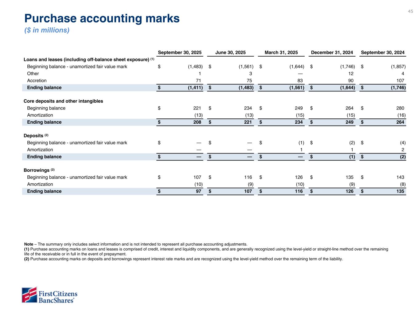 45 September 30, 2025 June 30, 2025 March 31, 2025 December 31, 2024 September 30, 2024 Loans and leases (including off-balance sheet exposure) (1) Beginning balance - unamortized fair value mark $ (1,483) $ (1,561) $ (1,644) $ (1,746) $ (1,857) Other 1 3 — 12 4 Accretion 71 75 83 90 107 Ending balance $ (1,411) $ (1,483) $ (1,561) $ (1,644) $ (1,746) Core deposits and other intangibles Beginning balance $ 221 $ 234 $ 249 $ 264 $ 280 Amortization (13) (13) (15) (15) (16) Ending balance $ 208 $ 221 $ 234 $ 249 $ 264 Deposits (2) Beginning balance - unamortized fair value mark $ — $ — $ (1) $ (2) $ (4) Amortization — — 1 1 2 Ending balance $ — $ — $ — $ (1) $ (2) Borrowings (2) Beginning balance - unamortized fair value mark $ 107 $ 116 $ 126 $ 135 $ 143 Amortization (10) (9) (10) (9) (8) Ending balance $ 97 $ 107 $ 116 $ 126 $ 135 Purchase accounting marks ($ in millions) Note – The summary only includes select information and is not intended to represent all purchase accounting adjustments. (1) Purchase accounting marks on loans and leases is comprised of credit, interest and liquidity components, and are generally recognized using the level-yield or straight-line method over the remaining life of the receivable or in full in the event of prepayment. (2) Purchase accounting marks on deposits and borrowings represent interest rate marks and are recognized using the level-yield method over the remaining term of the liability. Data has not yet been validated but is directional. To be finalized in subsequent draft.