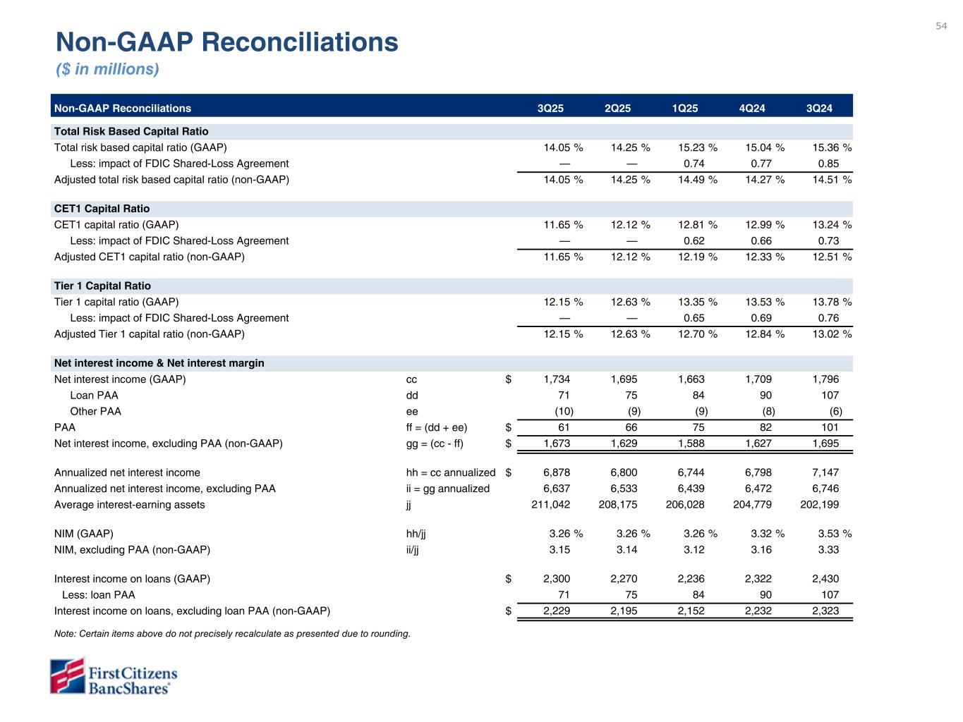 54 Non-GAAP Reconciliations ($ in millions) Non-GAAP Reconciliations 3Q25 2Q25 1Q25 4Q24 3Q24 Total Risk Based Capital Ratio Total risk based capital ratio (GAAP) 14.05 % 14.25 % 15.23 % 15.04 % 15.36 % Less: impact of FDIC Shared-Loss Agreement — — 0.74 0.77 0.85 Adjusted total risk based capital ratio (non-GAAP) 14.05 % 14.25 % 14.49 % 14.27 % 14.51 % CET1 Capital Ratio CET1 capital ratio (GAAP) 11.65 % 12.12 % 12.81 % 12.99 % 13.24 % Less: impact of FDIC Shared-Loss Agreement — — 0.62 0.66 0.73 Adjusted CET1 capital ratio (non-GAAP) 11.65 % 12.12 % 12.19 % 12.33 % 12.51 % Tier 1 Capital Ratio Tier 1 capital ratio (GAAP) 12.15 % 12.63 % 13.35 % 13.53 % 13.78 % Less: impact of FDIC Shared-Loss Agreement — — 0.65 0.69 0.76 Adjusted Tier 1 capital ratio (non-GAAP) 12.15 % 12.63 % 12.70 % 12.84 % 13.02 % Net interest income & Net interest margin Net interest income (GAAP) cc $ 1,734 1,695 1,663 1,709 1,796 Loan PAA dd 71 75 84 90 107 Other PAA ee (10) (9) (9) (8) (6) PAA ff = (dd + ee) $ 61 66 75 82 101 Net interest income, excluding PAA (non-GAAP) gg = (cc - ff) $ 1,673 1,629 1,588 1,627 1,695 Annualized net interest income hh = cc annualized $ 6,878 6,800 6,744 6,798 7,147 Annualized net interest income, excluding PAA ii = gg annualized 6,637 6,533 6,439 6,472 6,746 Average interest-earning assets jj 211,042 208,175 206,028 204,779 202,199 NIM (GAAP) hh/jj 3.26 % 3.26 % 3.26 % 3.32 % 3.53 % NIM, excluding PAA (non-GAAP) ii/jj 3.15 3.14 3.12 3.16 3.33 Interest income on loans (GAAP) $ 2,300 2,270 2,236 2,322 2,430 Less: loan PAA 71 75 84 90 107 Interest income on loans, excluding loan PAA (non-GAAP) $ 2,229 2,195 2,152 2,232 2,323 Note: Certain items above do not precisely recalculate as presented due to rounding.