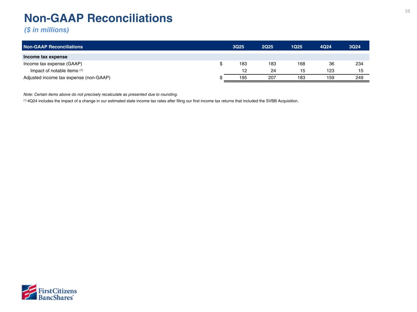 55 Non-GAAP Reconciliations ($ in millions) Non-GAAP Reconciliations 3Q25 2Q25 1Q25 4Q24 3Q24 Income tax expense Income tax expense (GAAP) $ 183 183 168 36 234 Impact of notable items (1) 12 24 15 123 15 Adjusted income tax expense (non-GAAP) $ 195 207 183 159 249 Note: Certain items above do not precisely recalculate as presented due to rounding. (1) 4Q24 includes the impact of a change in our estimated state income tax rates after filing our first income tax returns that included the SVBB Acquisition.