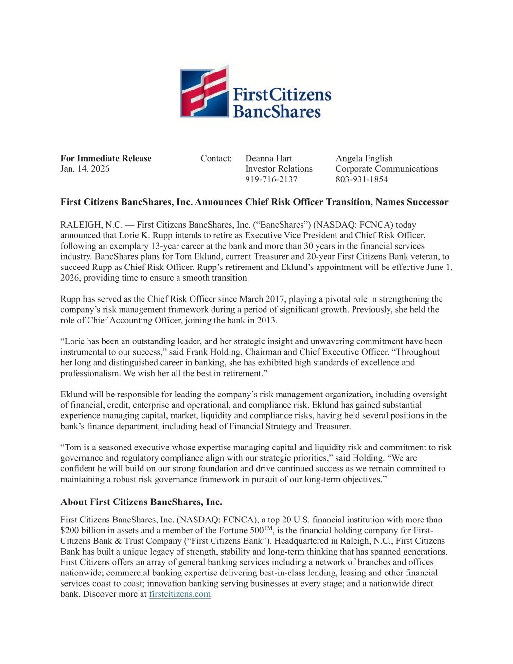 For Immediate Release Contact: Deanna Hart Angela English Jan. 14, 2026 Investor Relations Corporate Communications 919-716-2137 803-931-1854 First Citizens BancShares, Inc. Announces Chief Risk Officer Transition, Names Successor RALEIGH, N.C. — First Citizens BancShares, Inc. (“BancShares”) (NASDAQ: FCNCA) today announced that Lorie K. Rupp intends to retire as Executive Vice President and Chief Risk Officer, following an exemplary 13-year career at the bank and more than 30 years in the financial services industry. BancShares plans for Tom Eklund, current Treasurer and 20-year First Citizens Bank veteran, to succeed Rupp as Chief Risk Officer. Rupp’s retirement and Eklund’s appointment will be effective June 1, 2026, providing time to ensure a smooth transition. Rupp has served as the Chief Risk Officer since March 2017, playing a pivotal role in strengthening the company’s risk management framework during a period of significant growth. Previously, she held the role of Chief Accounting Officer, joining the bank in 2013. “Lorie has been an outstanding leader, and her strategic insight and unwavering commitment have been instrumental to our success,” said Frank Holding, Chairman and Chief Executive Officer. “Throughout her long and distinguished career in banking, she has exhibited high standards of excellence and professionalism. We wish her all the best in retirement.” Eklund will be responsible for leading the company’s risk management organization, including oversight of financial, credit, enterprise and operational, and compliance risk. Eklund has gained substantial experience managing capital, market, liquidity and compliance risks, having held several positions in the bank’s finance department, including head of Financial Strategy and Treasurer. “Tom is a seasoned executive whose expertise managing capital and liquidity risk and commitment to risk governance and regulatory compliance align with our strategic priorities,” said Holding. “We are confident he will build on our strong foundation and drive continued success as we remain committed to maintaining a robust risk governance framework in pursuit of our long-term objectives.” About First Citizens BancShares, Inc. First Citizens BancShares, Inc. (NASDAQ: FCNCA), a top 20 U.S. financial institution with more than $200 billion in assets and a member of the Fortune 500TM, is the financial holding company for First- Citizens Bank & Trust Company (“First Citizens Bank”). Headquartered in Raleigh, N.C., First Citizens Bank has built a unique legacy of strength, stability and long-term thinking that has spanned generations. First Citizens offers an array of general banking services including a network of branches and offices nationwide; commercial banking expertise delivering best-in-class lending, leasing and other financial services coast to coast; innovation banking serving businesses at every stage; and a nationwide direct bank. Discover more at firstcitizens.com.