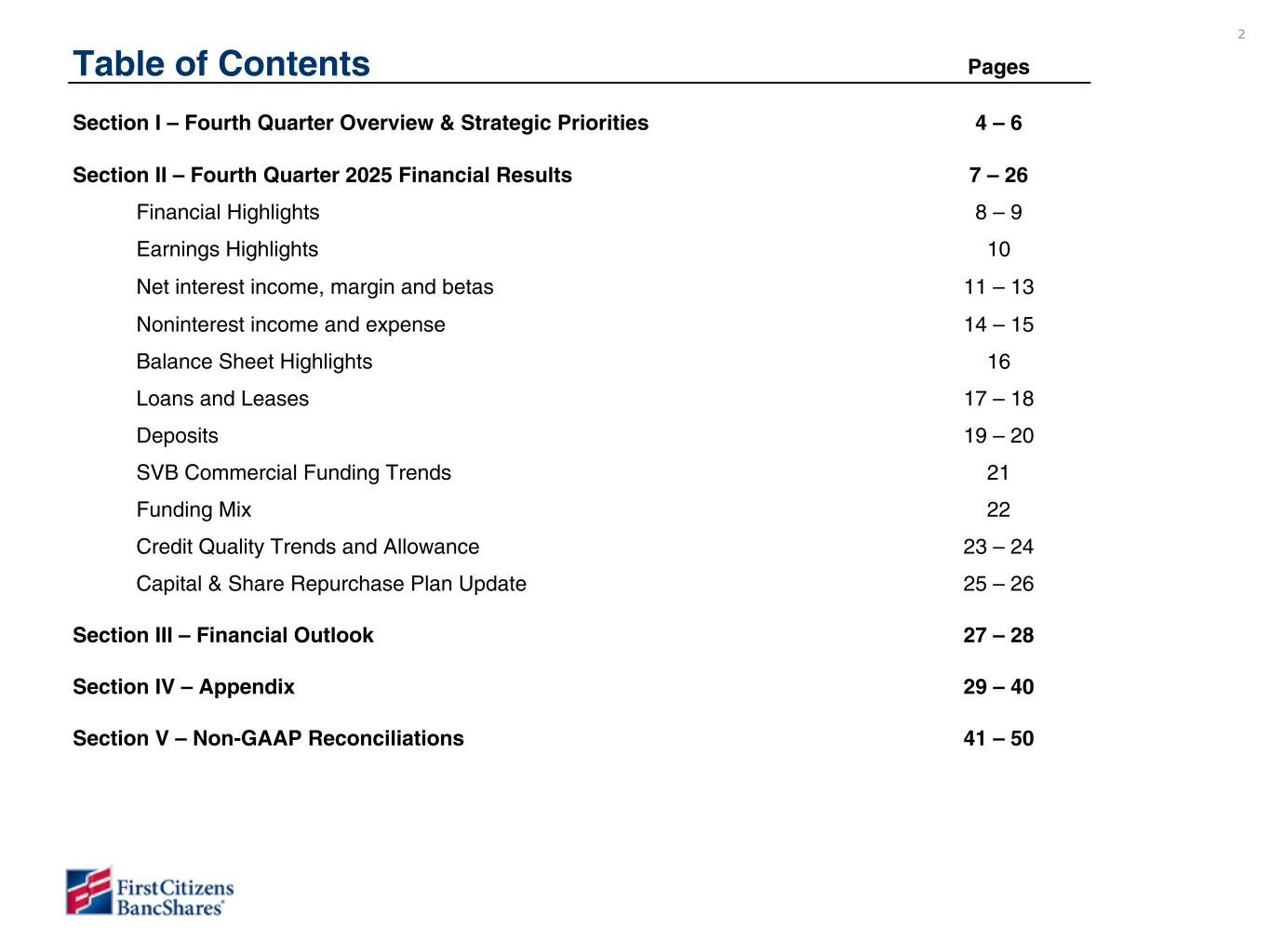 2 Table of Contents Pages Section I – Fourth Quarter Overview & Strategic Priorities 4 – 6 Section II – Fourth Quarter 2025 Financial Results 7 – 26 Financial Highlights 8 – 9 Earnings Highlights 10 Net interest income, margin and betas 11 – 13 Noninterest income and expense 14 – 15 Balance Sheet Highlights 16 Loans and Leases 17 – 18 Deposits 19 – 20 SVB Commercial Funding Trends 21 Funding Mix 22 Credit Quality Trends and Allowance 23 – 24 Capital & Share Repurchase Plan Update 25 – 26 Section III – Financial Outlook 27 – 28 Section IV – Appendix 29 – 40 Section V – Non-GAAP Reconciliations 41 – 50