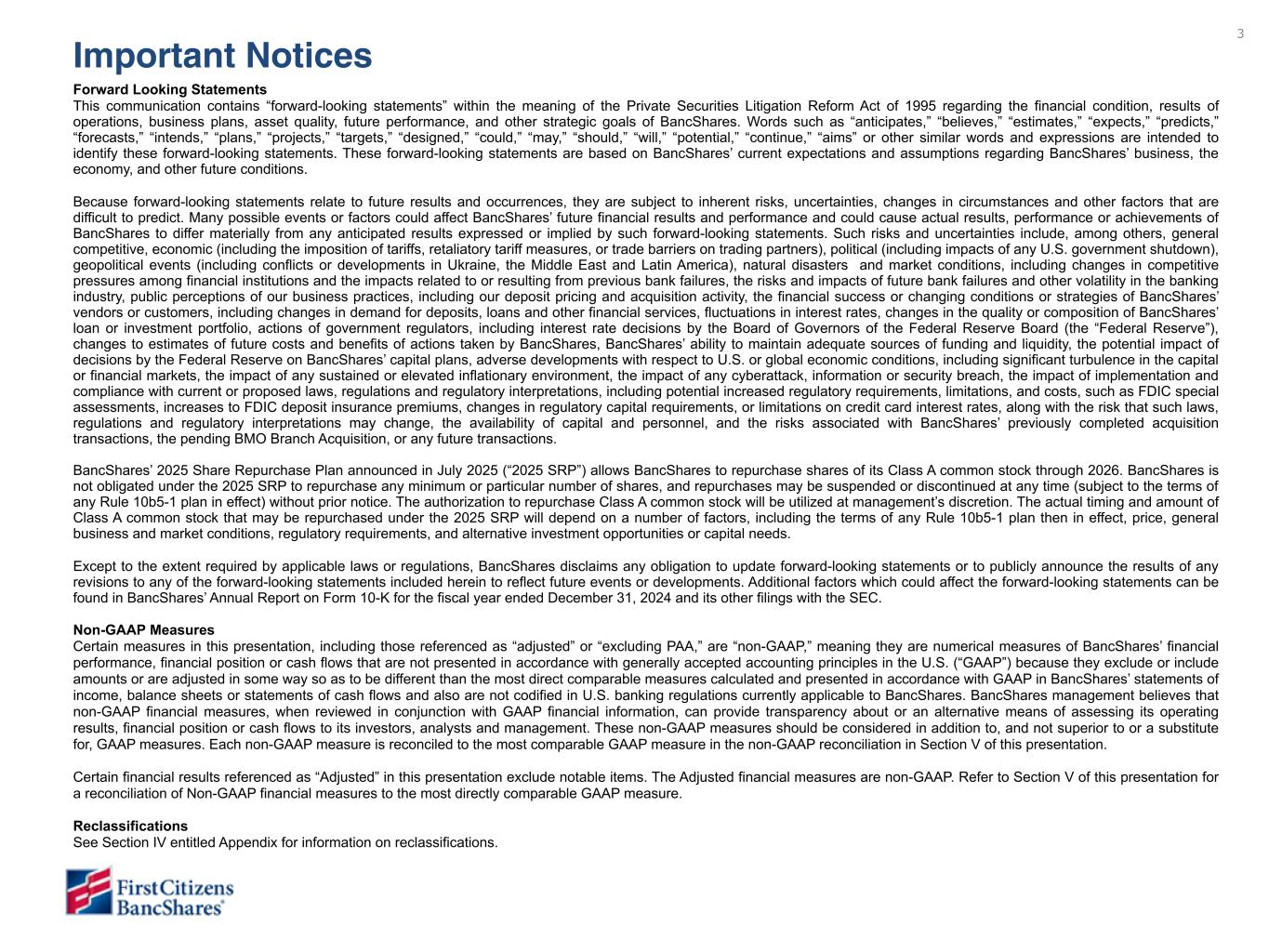 3 Forward Looking Statements This communication contains “forward-looking statements” within the meaning of the Private Securities Litigation Reform Act of 1995 regarding the financial condition, results of operations, business plans, asset quality, future performance, and other strategic goals of BancShares. Words such as “anticipates,” “believes,” “estimates,” “expects,” “predicts,” “forecasts,” “intends,” “plans,” “projects,” “targets,” “designed,” “could,” “may,” “should,” “will,” “potential,” “continue,” “aims” or other similar words and expressions are intended to identify these forward-looking statements. These forward-looking statements are based on BancShares’ current expectations and assumptions regarding BancShares’ business, the economy, and other future conditions. Because forward-looking statements relate to future results and occurrences, they are subject to inherent risks, uncertainties, changes in circumstances and other factors that are difficult to predict. Many possible events or factors could affect BancShares’ future financial results and performance and could cause actual results, performance or achievements of BancShares to differ materially from any anticipated results expressed or implied by such forward-looking statements. Such risks and uncertainties include, among others, general competitive, economic (including the imposition of tariffs, retaliatory tariff measures, or trade barriers on trading partners), political (including impacts of any U.S. government shutdown), geopolitical events (including conflicts or developments in Ukraine, the Middle East and Latin America), natural disasters and market conditions, including changes in competitive pressures among financial institutions and the impacts related to or resulting from previous bank failures, the risks and impacts of future bank failures and other volatility in the banking industry, public perceptions of our business practices, including our deposit pricing and acquisition activity, the financial success or changing conditions or strategies of BancShares’ vendors or customers, including changes in demand for deposits, loans and other financial services, fluctuations in interest rates, changes in the quality or composition of BancShares’ loan or investment portfolio, actions of government regulators, including interest rate decisions by the Board of Governors of the Federal Reserve Board (the “Federal Reserve”), changes to estimates of future costs and benefits of actions taken by BancShares, BancShares’ ability to maintain adequate sources of funding and liquidity, the potential impact of decisions by the Federal Reserve on BancShares’ capital plans, adverse developments with respect to U.S. or global economic conditions, including significant turbulence in the capital or financial markets, the impact of any sustained or elevated inflationary environment, the impact of any cyberattack, information or security breach, the impact of implementation and compliance with current or proposed laws, regulations and regulatory interpretations, including potential increased regulatory requirements, limitations, and costs, such as FDIC special assessments, increases to FDIC deposit insurance premiums, changes in regulatory capital requirements, or limitations on credit card interest rates, along with the risk that such laws, regulations and regulatory interpretations may change, the availability of capital and personnel, and the risks associated with BancShares’ previously completed acquisition transactions, the pending BMO Branch Acquisition, or any future transactions. BancShares’ 2025 Share Repurchase Plan announced in July 2025 (“2025 SRP”) allows BancShares to repurchase shares of its Class A common stock through 2026. BancShares is not obligated under the 2025 SRP to repurchase any minimum or particular number of shares, and repurchases may be suspended or discontinued at any time (subject to the terms of any Rule 10b5-1 plan in effect) without prior notice. The authorization to repurchase Class A common stock will be utilized at management’s discretion. The actual timing and amount of Class A common stock that may be repurchased under the 2025 SRP will depend on a number of factors, including the terms of any Rule 10b5-1 plan then in effect, price, general business and market conditions, regulatory requirements, and alternative investment opportunities or capital needs. Except to the extent required by applicable laws or regulations, BancShares disclaims any obligation to update forward-looking statements or to publicly announce the results of any revisions to any of the forward-looking statements included herein to reflect future events or developments. Additional factors which could affect the forward-looking statements can be found in BancShares’ Annual Report on Form 10-K for the fiscal year ended December 31, 2024 and its other filings with the SEC. Non-GAAP Measures Certain measures in this presentation, including those referenced as “adjusted” or “excluding PAA,” are “non-GAAP,” meaning they are numerical measures of BancShares’ financial performance, financial position or cash flows that are not presented in accordance with generally accepted accounting principles in the U.S. (“GAAP”) because they exclude or include amounts or are adjusted in some way so as to be different than the most direct comparable measures calculated and presented in accordance with GAAP in BancShares’ statements of income, balance sheets or statements of cash flows and also are not codified in U.S. banking regulations currently applicable to BancShares. BancShares management believes that non-GAAP financial measures, when reviewed in conjunction with GAAP financial information, can provide transparency about or an alternative means of assessing its operating results, financial position or cash flows t