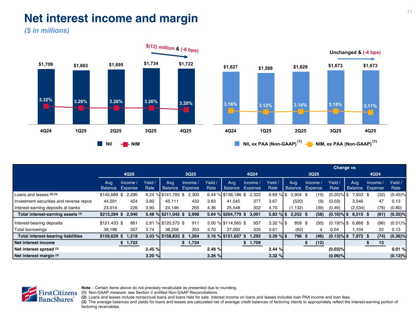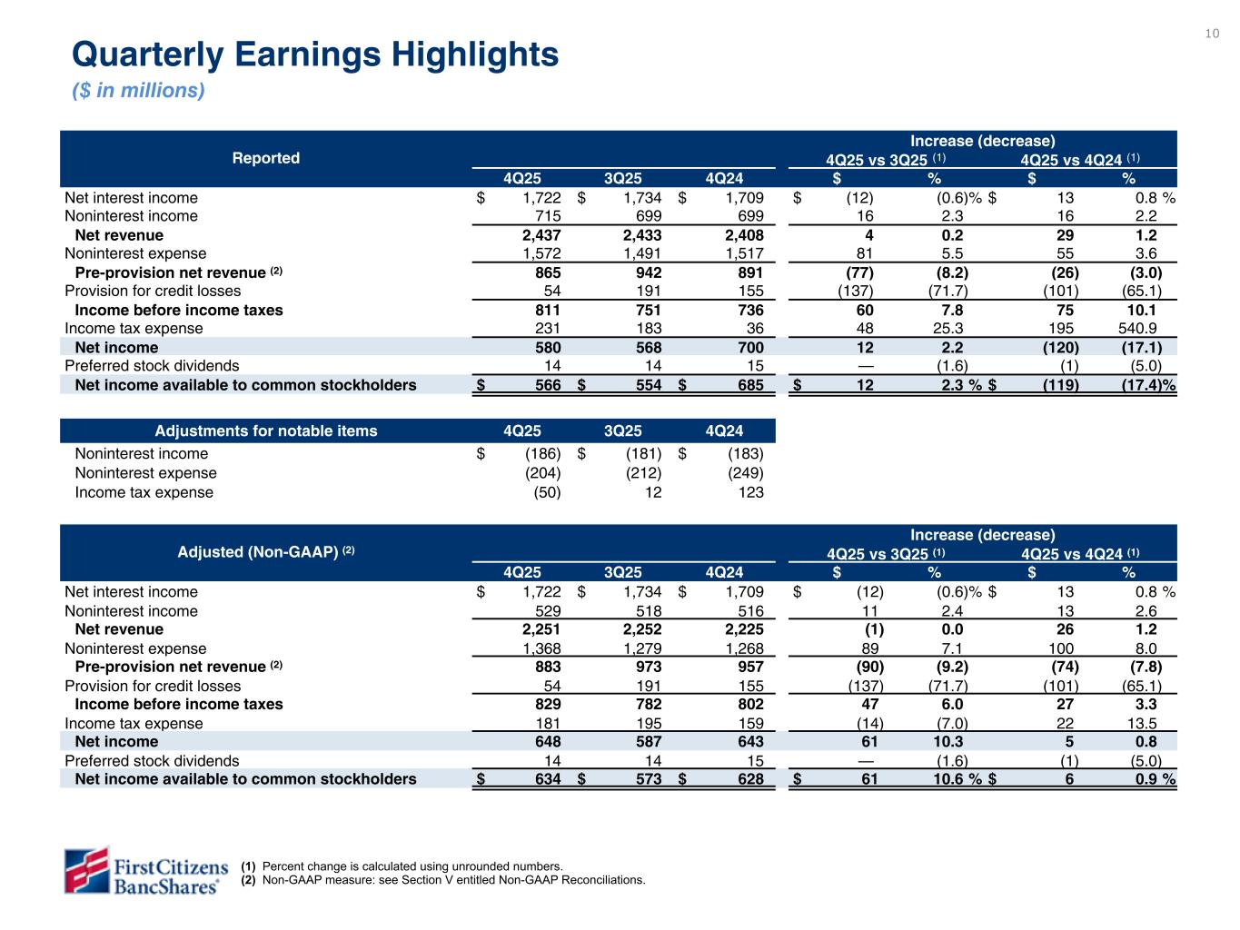 10 Reported Increase (decrease) 4Q25 vs 3Q25 (1) 4Q25 vs 4Q24 (1) 4Q25 3Q25 4Q24 $ % $ % Net interest income $ 1,722 $ 1,734 $ 1,709 $ (12) (0.6) % $ 13 0.8 % Noninterest income 715 699 699 16 2.3 16 2.2 Net revenue 2,437 2,433 2,408 4 0.2 29 1.2 Noninterest expense 1,572 1,491 1,517 81 5.5 55 3.6 Pre-provision net revenue (2) 865 942 891 (77) (8.2) (26) (3.0) Provision for credit losses 54 191 155 (137) (71.7) (101) (65.1) Income before income taxes 811 751 736 60 7.8 75 10.1 Income tax expense 231 183 36 48 25.3 195 540.9 Net income 580 568 700 12 2.2 (120) (17.1) Preferred stock dividends 14 14 15 — (1.6) (1) (5.0) Net income available to common stockholders $ 566 $ 554 $ 685 $ 12 2.3 % $ (119) (17.4) % Adjustments for notable items 4Q25 3Q25 4Q24 Noninterest income $ (186) $ (181) $ (183) Noninterest expense (204) (212) (249) Income tax expense (50) 12 123 Adjusted (Non-GAAP) (2) Increase (decrease) 4Q25 vs 3Q25 (1) 4Q25 vs 4Q24 (1) 4Q25 3Q25 4Q24 $ % $ % Net interest income $ 1,722 $ 1,734 $ 1,709 $ (12) (0.6) % $ 13 0.8 % Noninterest income 529 518 516 11 2.4 13 2.6 Net revenue 2,251 2,252 2,225 (1) 0.0 26 1.2 Noninterest expense 1,368 1,279 1,268 89 7.1 100 8.0 Pre-provision net revenue (2) 883 973 957 (90) (9.2) (74) (7.8) Provision for credit losses 54 191 155 (137) (71.7) (101) (65.1) Income before income taxes 829 782 802 47 6.0 27 3.3 Income tax expense 181 195 159 (14) (7.0) 22 13.5 Net income 648 587 643 61 10.3 5 0.8 Preferred stock dividends 14 14 15 — (1.6) (1) (5.0) Net income available to common stockholders $ 634 $ 573 $ 628 $ 61 10.6 % $ 6 0.9 % Quarterly Earnings Highlights ($ in millions) (1) Percent change is calculated using unrounded numbers. (2) Non-GAAP measure: see Section V entitled Non-GAAP Reconciliations.