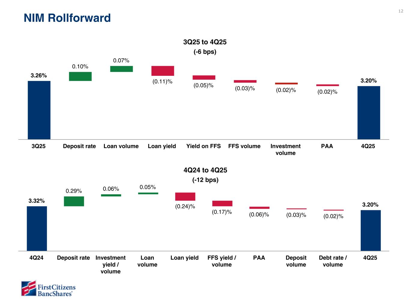 11 $1,627 $1,588 $1,629 $1,673 $1,673 3.16% 3.12% 3.14% 3.15% 3.11% NII, ex PAA (Non-GAAP) NIM, ex PAA (Non-GAAP) 4Q24 1Q25 2Q25 3Q25 4Q25 $1,709 $1,663 $1,695 $1,734 $1,722 3.32% 3.26% 3.26% 3.26% 3.20% NII NIM 4Q24 1Q25 2Q25 3Q25 4Q25 $(12) million & (-6 bps) Net interest income and margin ($ in millions) Unchanged & (-4 bps) (1) (1) Change vs 4Q25 3Q25 4Q24 3Q25 4Q24 Avg Balance Income / Expense Yield / Rate Avg Balance Income / Expense Yield / Rate Avg Balance Income / Expense Yield / Rate Avg Balance Income / Expense Yield / Rate Avg Balance Income / Expense Yield / Rate Loans and leases (2) (3) $ 145,689 $ 2,290 6.24 % $ 141,785 $ 2,300 6.44 % $ 138,186 $ 2,322 6.69 % $ 3,904 $ (10) (0.20) % $ 7,503 $ (32) (0.45) % Investment securities and reverse repos 44,591 424 3.80 45,111 433 3.83 41,045 377 3.67 (520) (9) (0.03) 3,546 47 0.13 Interest-earning deposits at banks 23,014 226 3.90 24,146 265 4.36 25,548 302 4.70 (1,132) (39) (0.46) (2,534) (76) (0.80) Total interest-earning assets (3) $ 213,294 $ 2,940 5.48 % $ 211,042 $ 2,998 5.64 % $ 204,779 $ 3,001 5.83 % $ 2,252 $ (58) (0.16) % $ 8,515 $ (61) (0.35) % Interest-bearing deposits $ 121,433 $ 861 2.81 % $ 120,575 $ 911 3.00 % $ 114,565 $ 957 3.32 % $ 858 $ (50) (0.19) % $ 6,868 $ (96) (0.51) % Total borrowings 38,196 357 3.74 38,258 353 3.70 37,092 335 3.61 (62) 4 0.04 1,104 22 0.13 Total interest-bearing liabilities $ 159,629 $ 1,218 3.03 % $ 158,833 $ 1,264 3.16 % $ 151,657 $ 1,292 3.39 % $ 796 $ (46) (0.13) % $ 7,972 $ (74) (0.36) % Net interest income $ 1,722 $ 1,734 $ 1,709 $ (12) $ 13 Net interest spread (3) 2.45 % 2.48 % 2.44 % (0.03) % 0.01 % Net interest margin (3) 3.20 % 3.26 % 3.32 % (0.06) % (0.12) % Note – Certain items above do not precisely recalculate as presented due to rounding. (1) Non-GAAP measure: see Section V entitled Non-GAAP Reconciliations. (2) Loans and leases include nonaccrual loans and loans held for sale. Interest income on loans and leases includes loan PAA income and loan fees. (3) The average balances and yields for loans and leases are calculated net of average credit balances of factoring clients to appropriately reflect the interest-earning portion of factoring receivables.