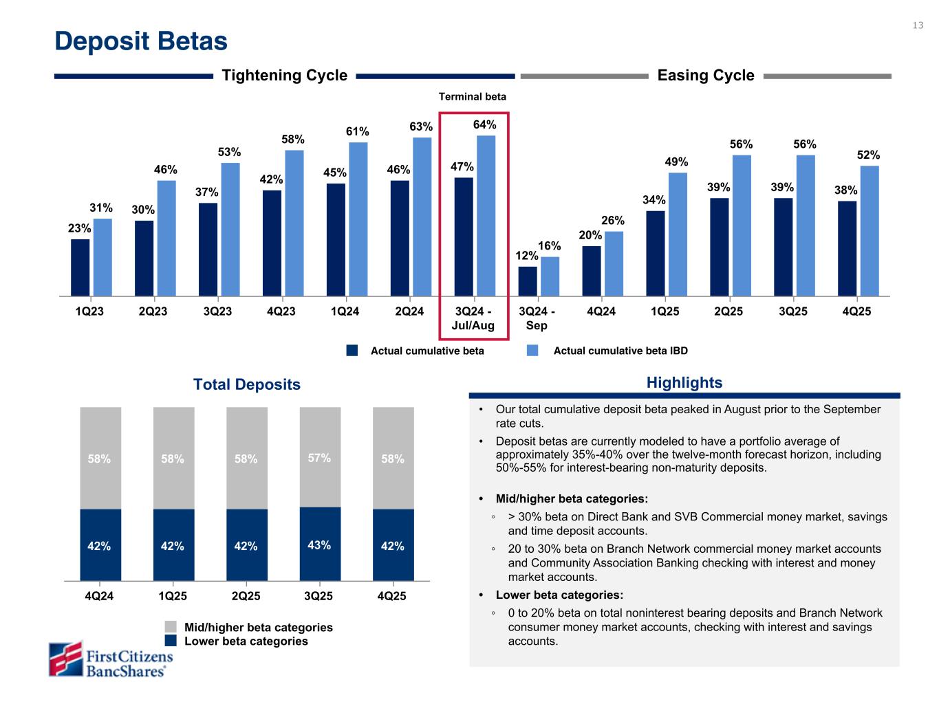 12 3.32% 0.29% 0.06% 0.05% (0.24)% (0.17)% (0.06)% (0.03)% (0.02)% 3.20% 4Q24 Deposit rate Investment yield / volume Loan volume Loan yield FFS yield / volume PAA Deposit volume Debt rate / volume 4Q25 4Q24 to 4Q25 (-12 bps) NIM Rollforward 3.26% 0.10% 0.07% (0.11)% (0.05)% (0.03)% (0.02)% (0.02)% 3.20% 3Q25 Deposit rate Loan volume Loan yield Yield on FFS FFS volume Investment volume PAA 4Q25 3Q25 to 4Q25 (-6 bps)